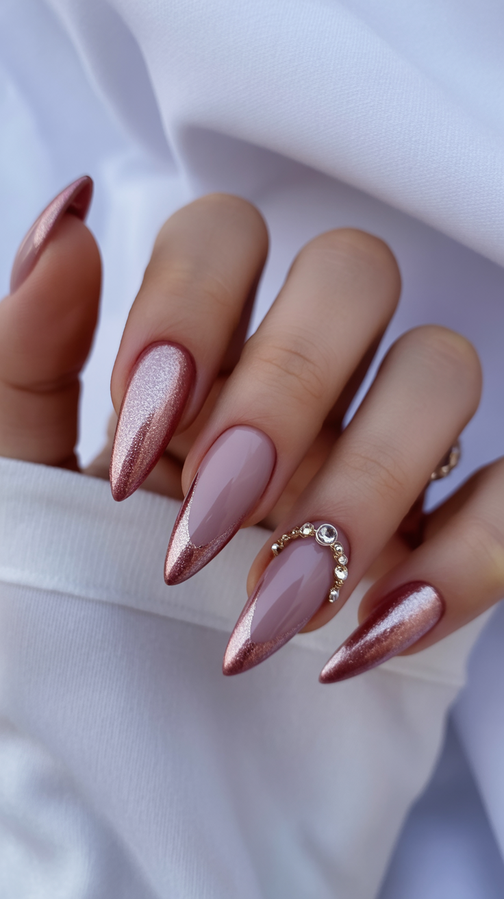 This manicure feels bold and confident and is undeniably glamorous. The soft base and the rich rose metallic tips set a great contrast to give the almond shape a dramatic and sculpted look. It’s very powerful without being flashy. Very modern and very intentional.