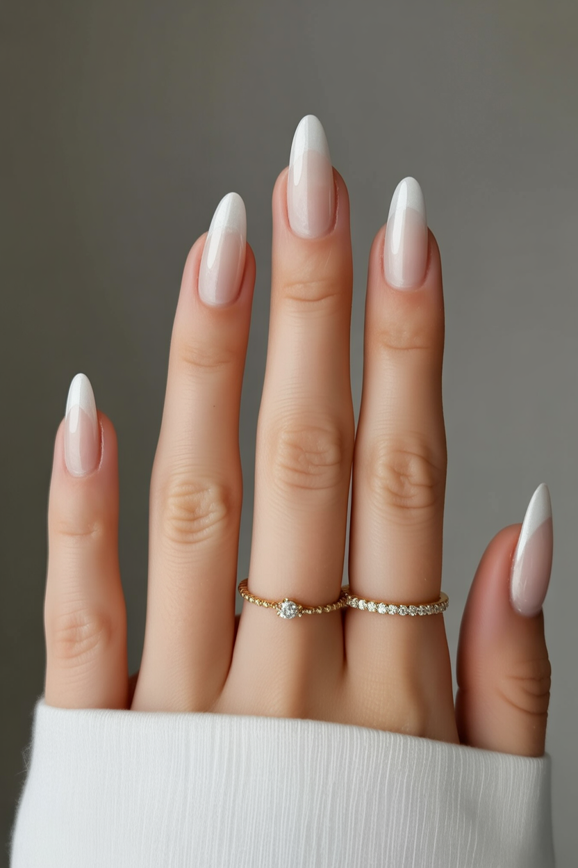 Bright, natural looks and almond shapes are the clean, modern twist and are very classy. Almond French nails are always soft and clean, with no harsh spots, and pleasing to the eye. Adding a soft gradient, with a modern twist, and adding a nice, milky white, it really enhances the airiness and great look. Very flattering to a lot of different hand styles.