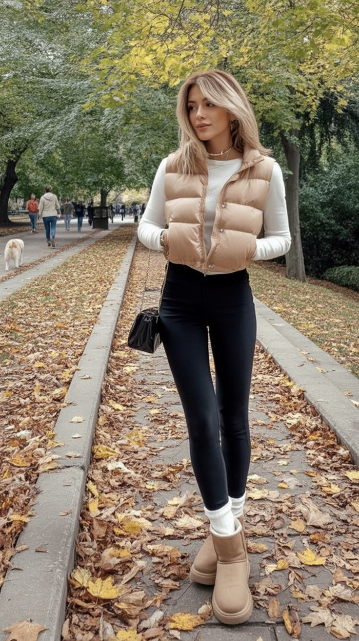 There’s something effortlessly cute and pulled-together about this outfit—like the stylish friend who always looks great, even when she’s just heading out for a coffee run. The beige puffer vest adds instant warmth without the bulk, and the high-waisted leggings balance comfort with a sleek silhouette. Topped off with cozy ankle boots and a crossbody bag, it’s that casual kind of glam we all crave when the leaves start to fall.
