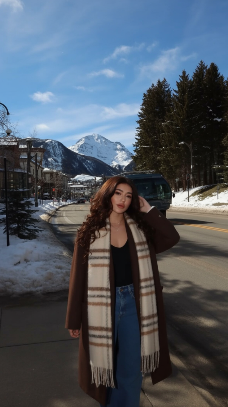 This outfit looks like a Pinterest board come to life—rich earth tones, textured knits, and that dreamy mountain-town aesthetic. The longline coat and plaid scarf combo are perfect for freezing winter days when you want to stay warm but look totally pulled together. Add in those softly curled layers, and you’ve got effortless snow bunny energy.