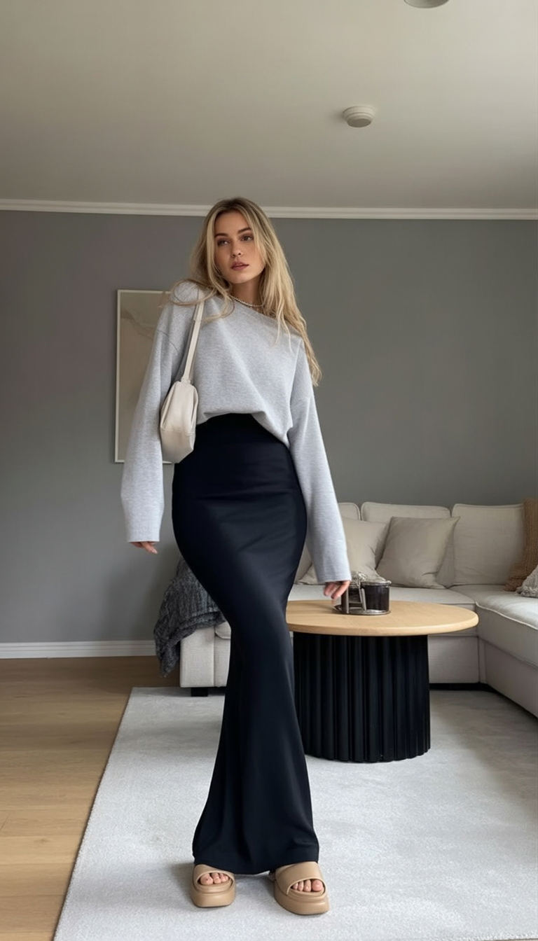 This look is what happens when cozy meets chic. The oversized gray sweatshirt gives off a relaxed, just-woke-up-like-this charm, while the sleek black maxi skirt adds a whisper of sophistication. It’s perfect for a day spent sipping coffee and catching up on your favorite podcasts—with style.