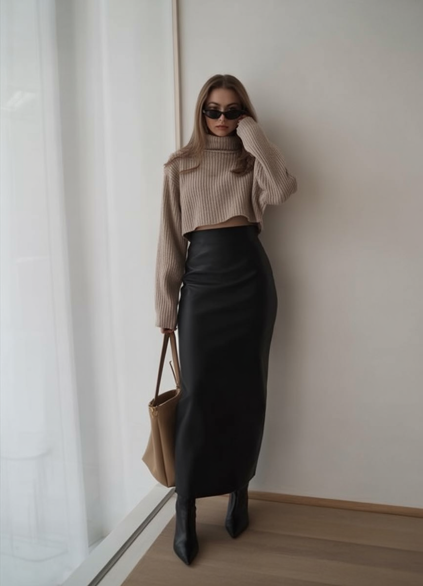 This one’s for the woman who walks into a room and owns it—no loud colors, just pure presence. The high-waisted leather pencil skirt and cropped knit turtleneck say “power,” but in a way that’s still cozy and classy. The dark sunnies? Iconic. It’s minimalist, sure—but far from boring.