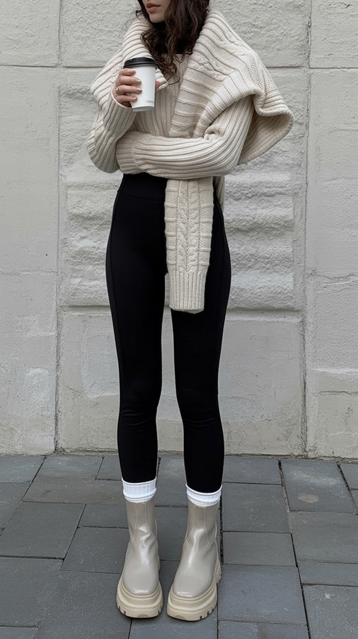 If “I just stepped out to grab a latte, but make it fashion” were an outfit, this would be it. The chunky knit draped over the shoulders is giving major effortless cozy vibes, while the ribbed sweater and leggings hug just enough to keep it flattering. Finished off with thick socks and chunky boots, it’s made for those soft, in-between mornings when you want comfort without compromising style.