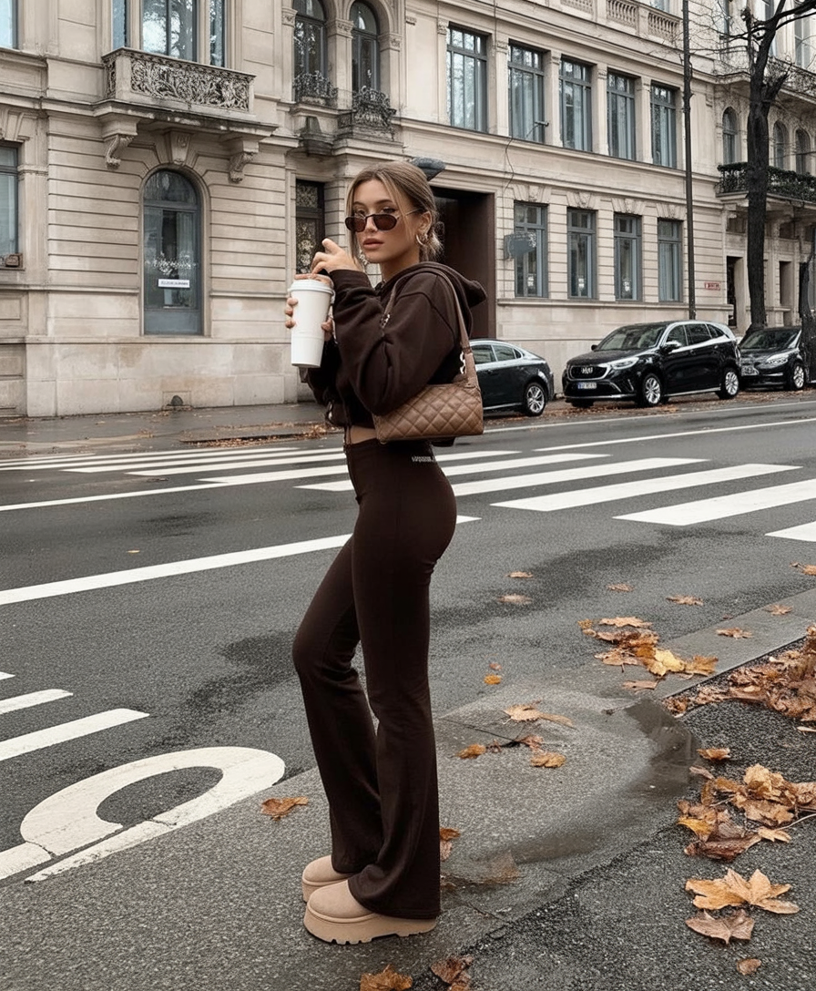 This warm brown two-piece set is the ultimate comfy dream. There’s a quiet luxury in the simplicity—fitted, flattering, and oh-so-soft-looking. With a cropped hoodie and wide-leg bottoms, it feels laid-back but intentional, especially when styled with platform UGGs and tiny designer accessories. Hello, street style queen.
