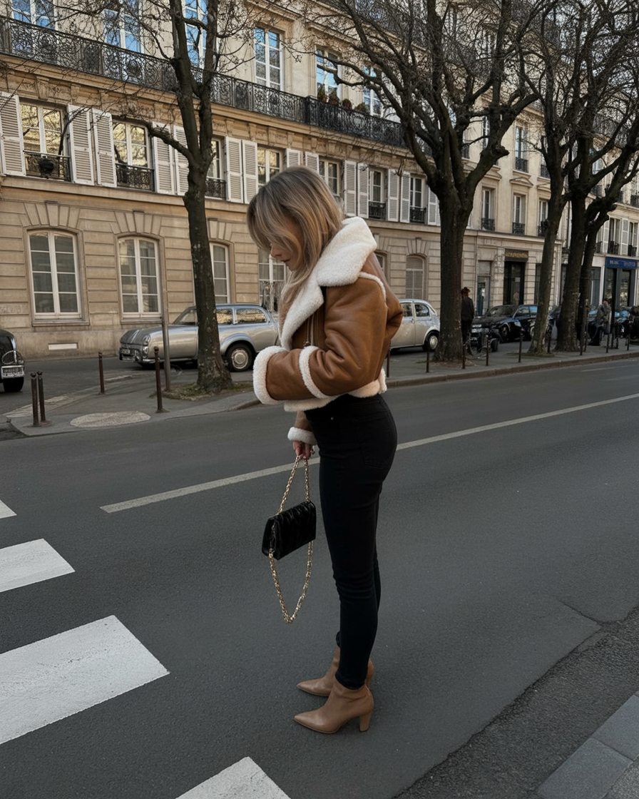 Classic with a touch of sass, this cropped shearling jacket in rich toffee is winter’s answer to polished layering. It’s cozy but structured—balancing out the slim high-waisted jeans and sleek booties for an ultra-modern silhouette. The crossbody chain bag adds just enough shine to make it feel luxe.