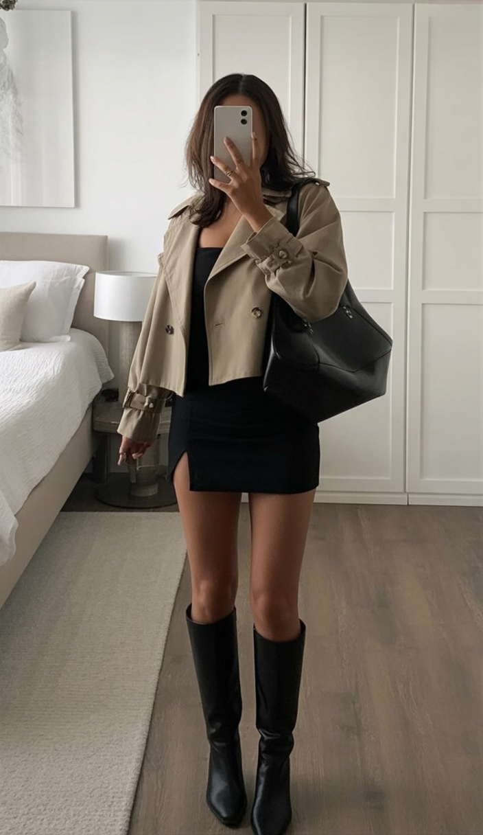 There’s a quiet confidence in simplicity, and this neutral-toned mini outfit proves it. The cropped trench adds just enough polish, while the mini dress and knee-high boots keep things cool and baddie-approved. Perfect for days when you want to look pulled together without trying too hard—just throw on some oversized sunnies and you’re golden.