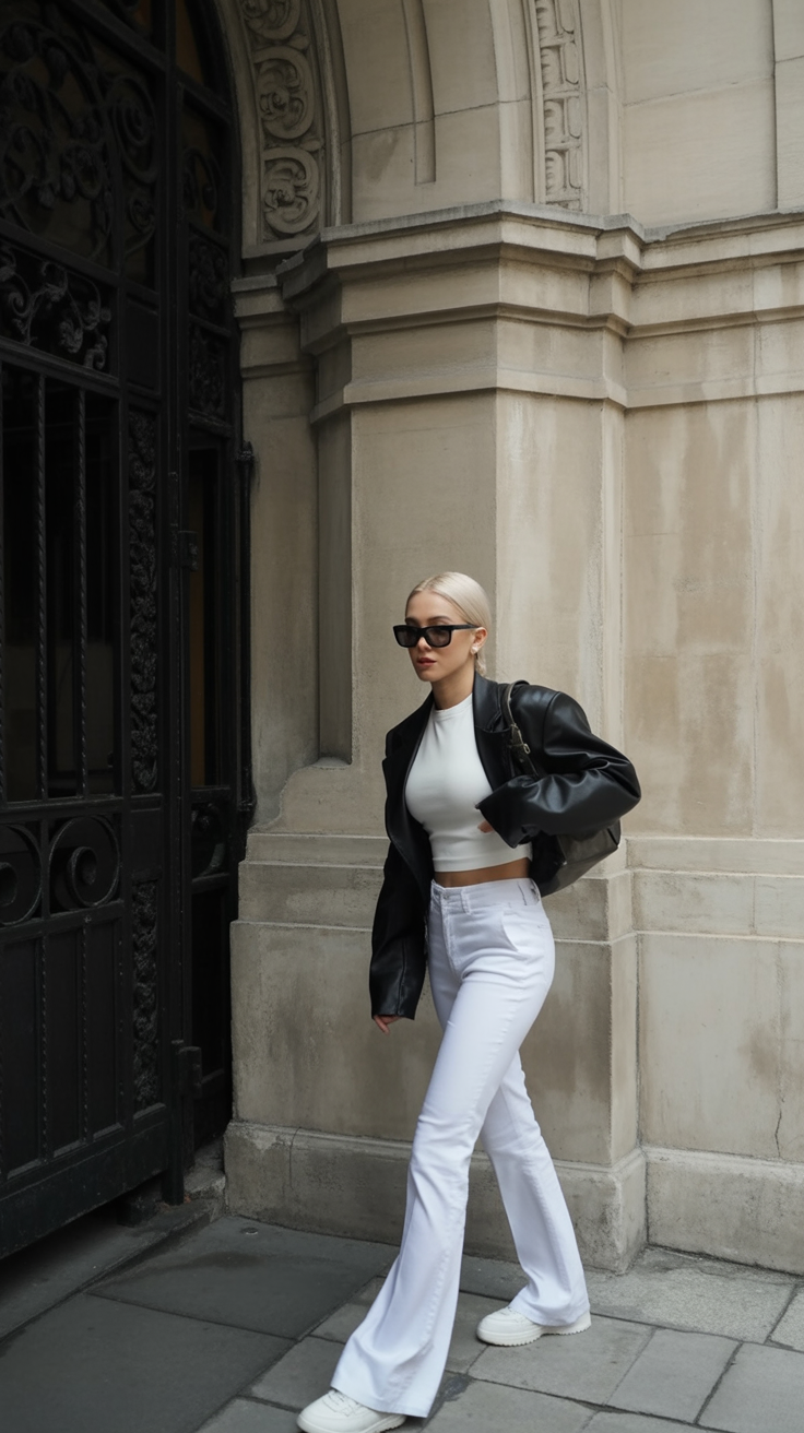 Fresh, crisp, and effortlessly modern—this black-and-white combo feels like high fashion’s take on streetwear. The cropped white top meets high-waisted flare pants for a sleek silhouette, while the oversized leather jacket brings that street-style drama. Sneakers give it a sporty edge, perfect for keeping up with a fast-paced day.