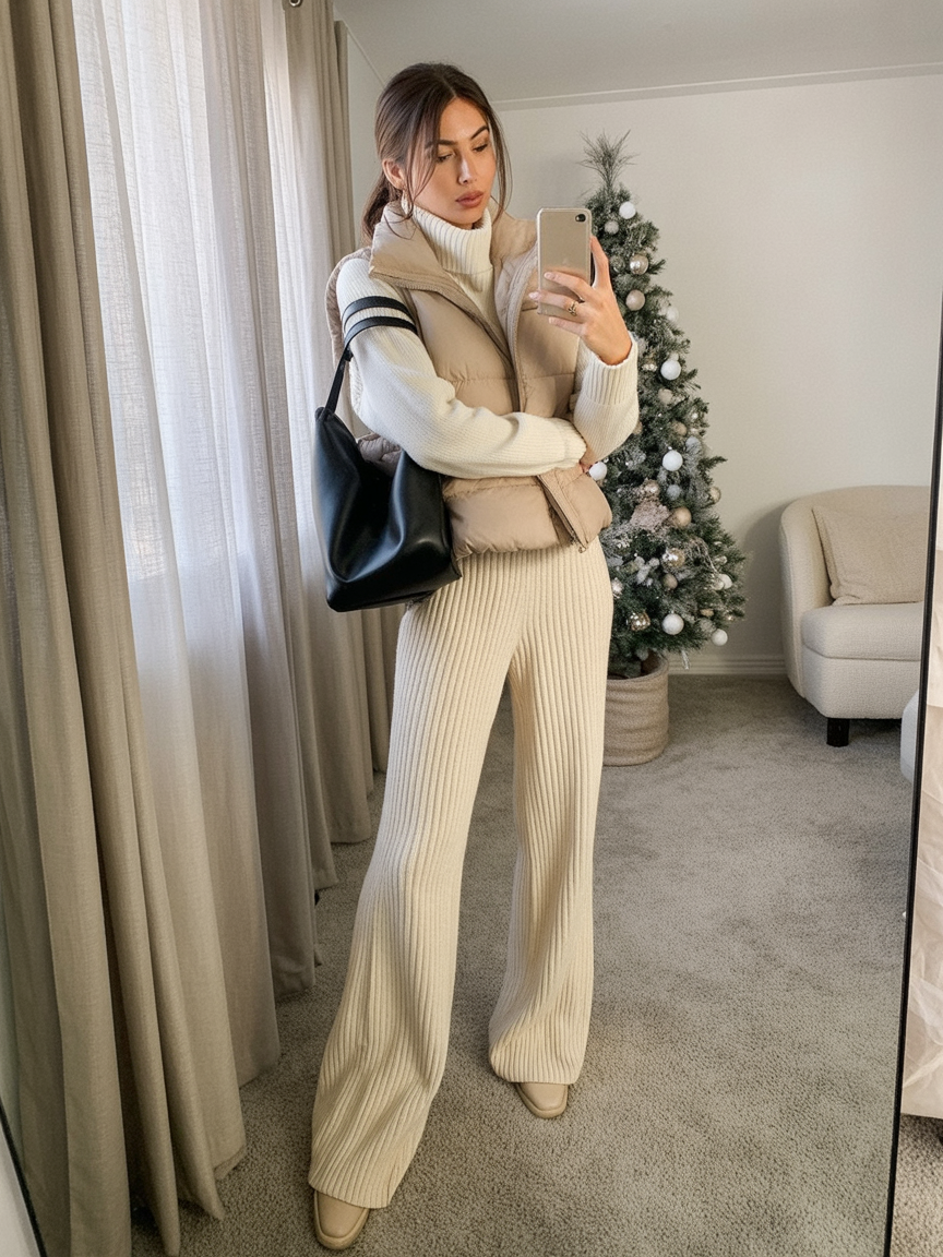 Snuggly doesn’t mean sloppy—and this outfit proves it. The ribbed knit set is soft, feminine, and totally cozy without sacrificing style. The neutral tones make it feel clean and elevated, while the matching puffer vest gives it that perfect winter-friendly finish. It’s giving “elegant hostess on a snow day” energy.