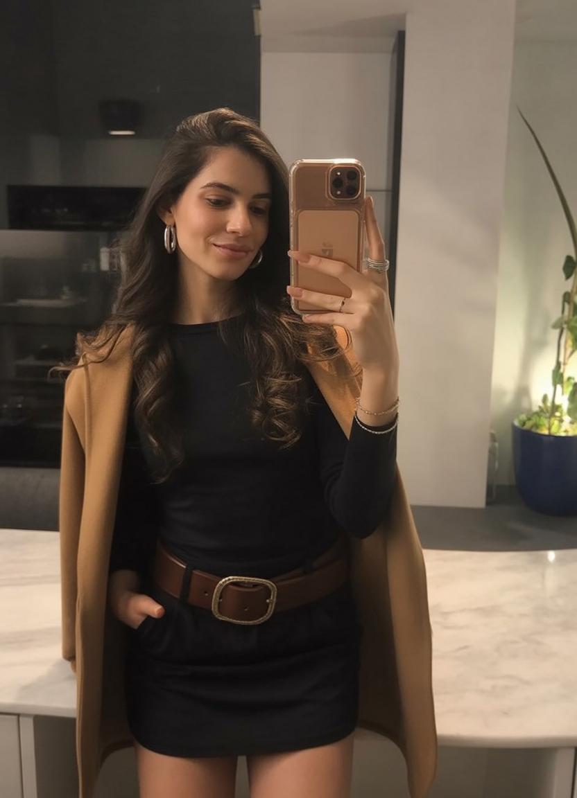 There’s something so refined and classy about camel—and when you throw it over a black mini and cinch it with a bold belt? Total boss move. This look walks the line between understated and attention-grabbing, with clean lines, rich textures, and confident accessorizing.