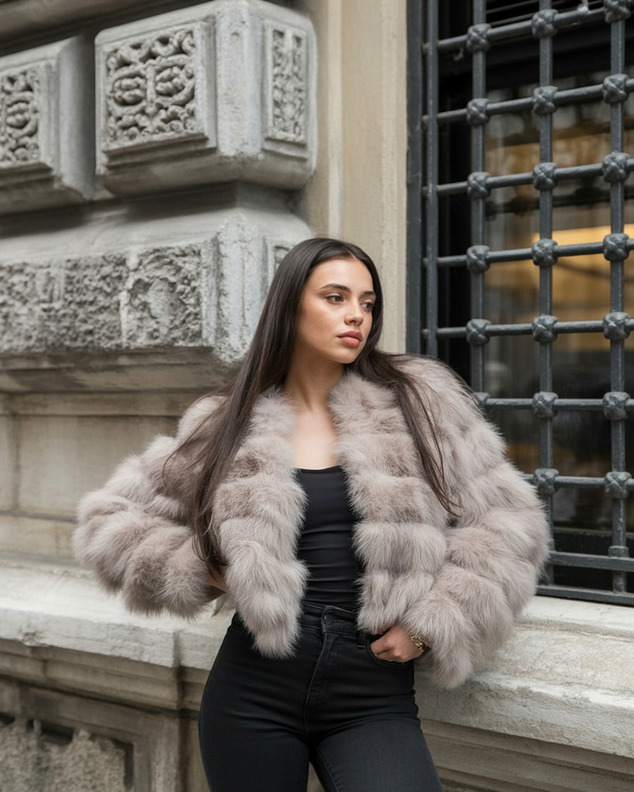 Who says faux fur can’t go casual? This outfit pairs a dramatic cropped fur jacket with throwback jeans and classic Adidas sneakers—and it totally works. It’s the kind of high-low styling that fashion editors swear by: equal parts relaxed and runway.