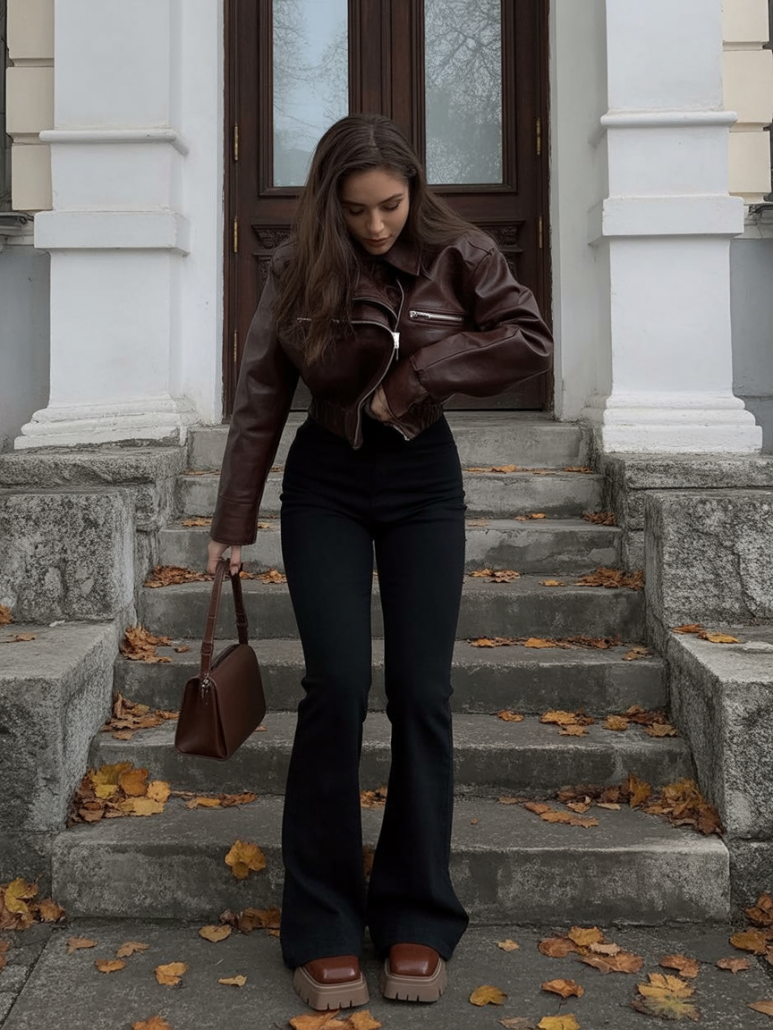 Chocolate leather and flared pants? Yes, please. This look blends edgy textures with retro silhouettes, giving you a winter-ready outfit that still feels super current. The oversized moto jacket adds a little drama, while those chunky soles make a playful statement.