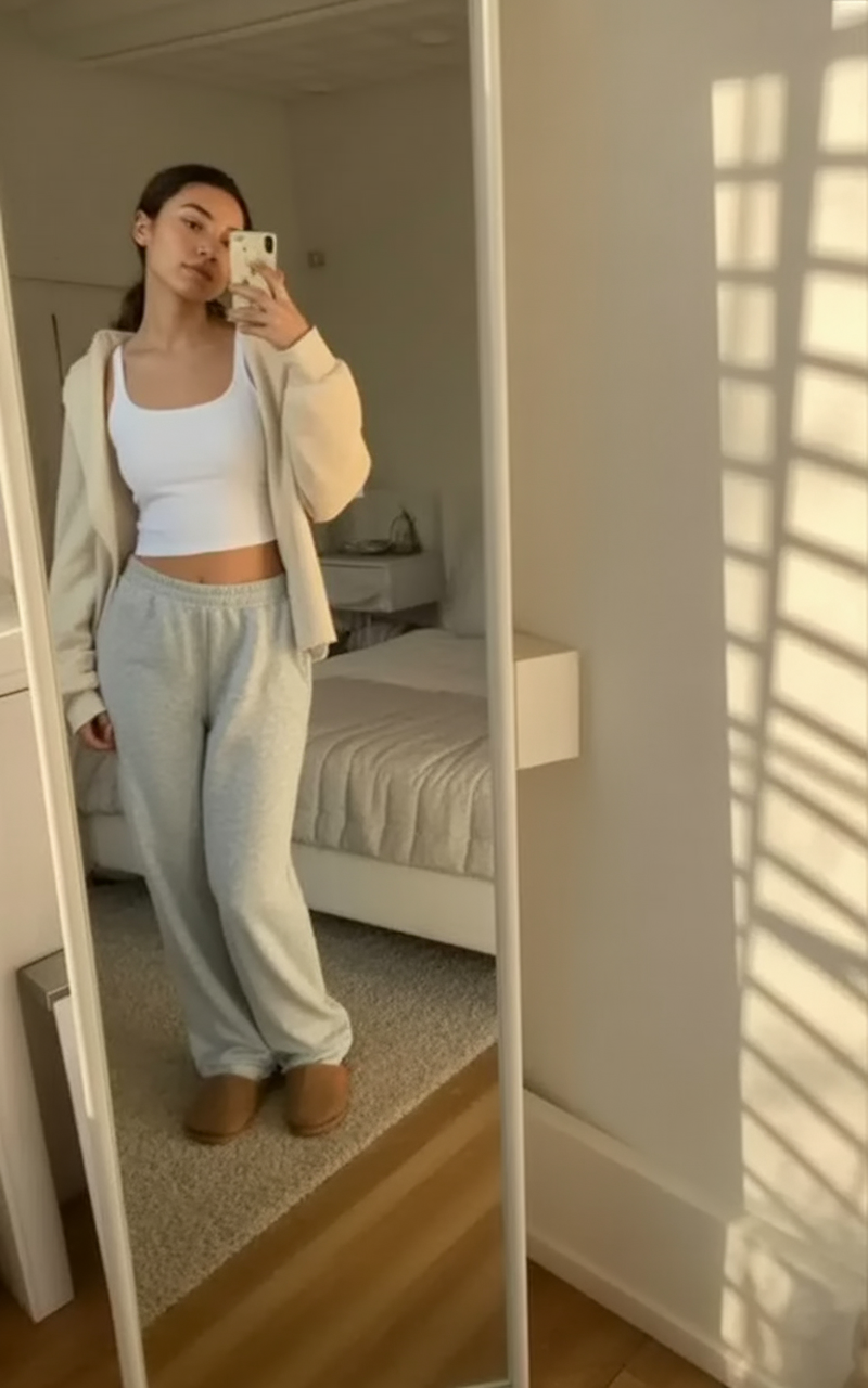 This outfit leans into that slightly rebellious, city-ready energy that makes sweatpants feel intentional again. The muted tone, cropped layers, and confident stance give it a modern aesthetic that feels fresh and bold without being loud. It’s relaxed, a little baggy, and very now—perfect for women who like their comfort with a hint of attitude. This is the kind of look you’d wear when you want to feel cool but not overstyled, whether you’re heading out for coffee or just enjoying lazy days around town.