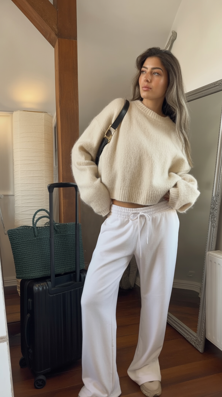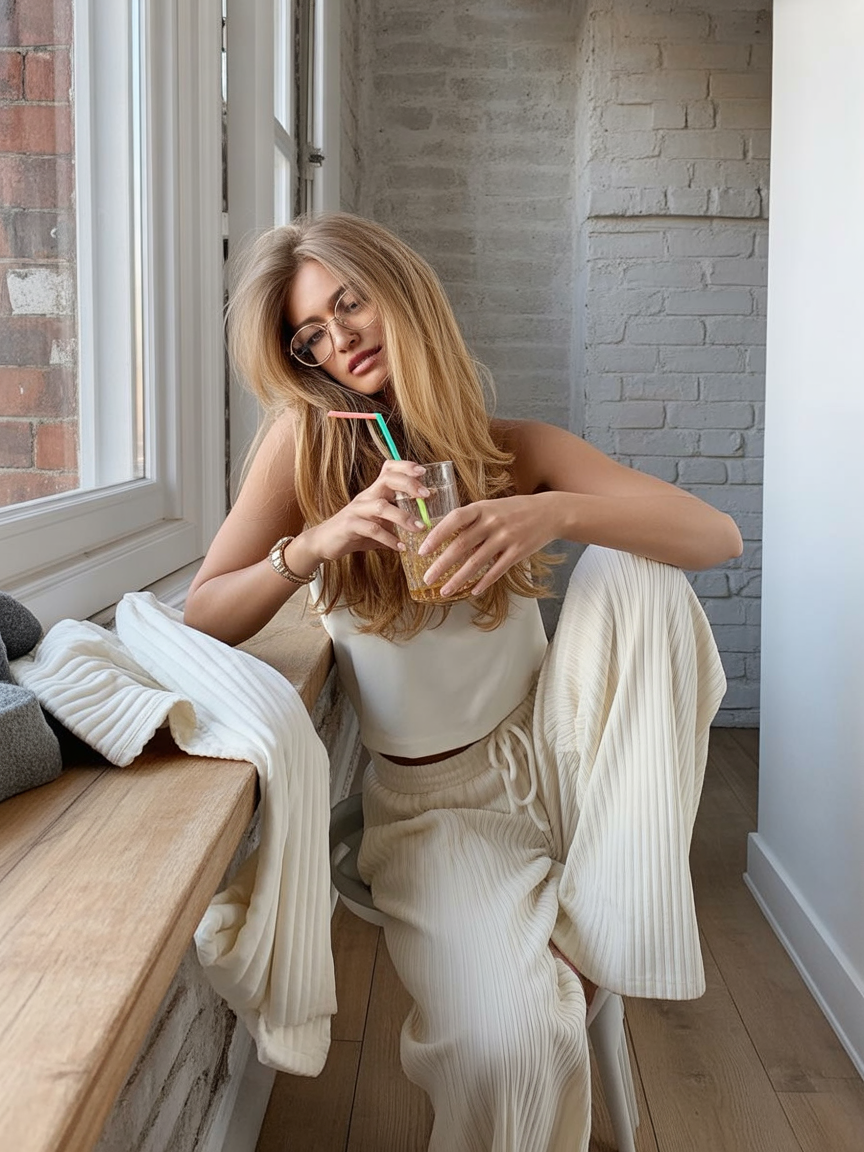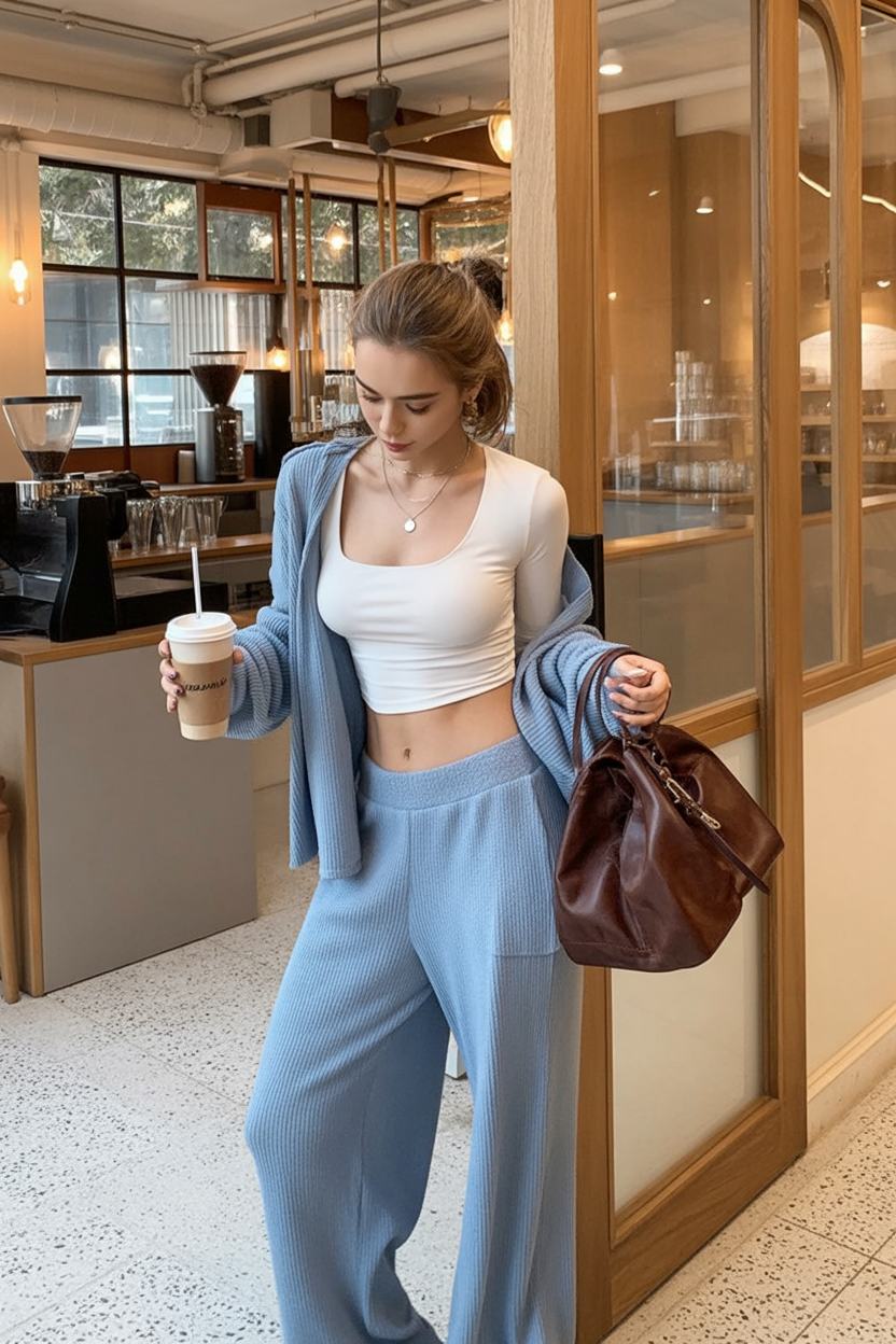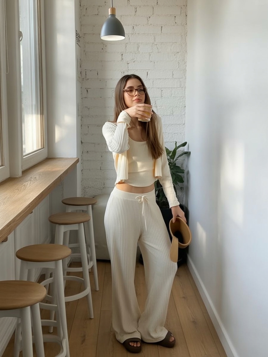 There’s something quietly luxurious about a soft knit set that feels like it belongs in a sunlit café. This look gives off that effortless morning energy—the kind where you’re not rushing, your coffee is still hot, and you actually enjoy getting dressed. The creamy tone feels calm and modern, while the relaxed fit makes it feel approachable and cute without trying too hard. It’s the kind of outfit that whispers confidence, perfect for casual moments when you still want to feel put together, whether you’re easing into lazy days or stepping out for a quiet walk.