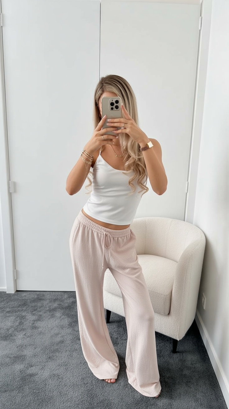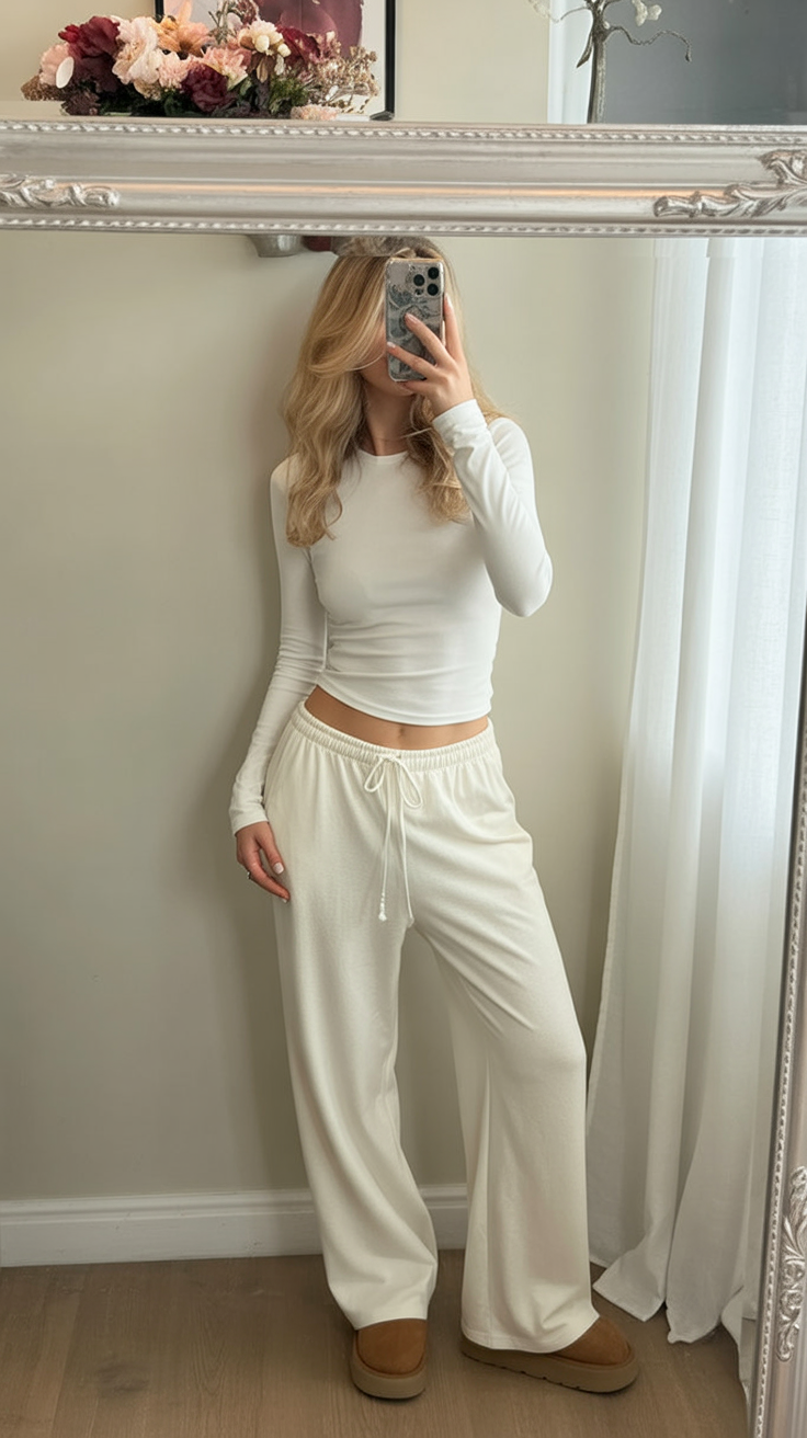What sets this outfit apart is comfort and refinement. Pairing the feminine, flowing wide-leg pants with an equally relaxed and polished top is perfect for effortless all-day styling. This is great for those looking for a refined outfit yet still wanting something comfortable and a little more elevated than standard loungewear. This versatile outfit is perfect for all loungewear-styled activities.