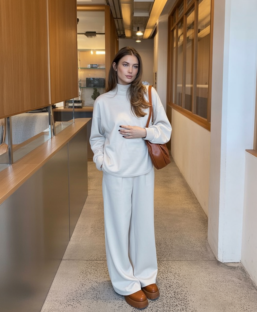 This look proves that comfy outfits don’t have to stay indoors. With its clean lines and soft neutral shade, it feels refined enough to wear out while still being incredibly comfortable. There’s a quiet elegance here that makes it suitable for casual meetings, relaxed work settings, or even a low-key party with friends. It’s confident, modern, and easy to imagine in everyday life.