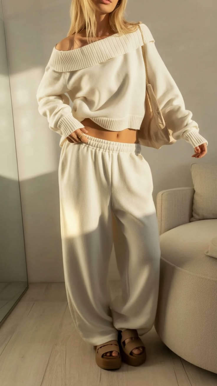 13. Off-Shoulder Knit Set with Soft Evening Warmth