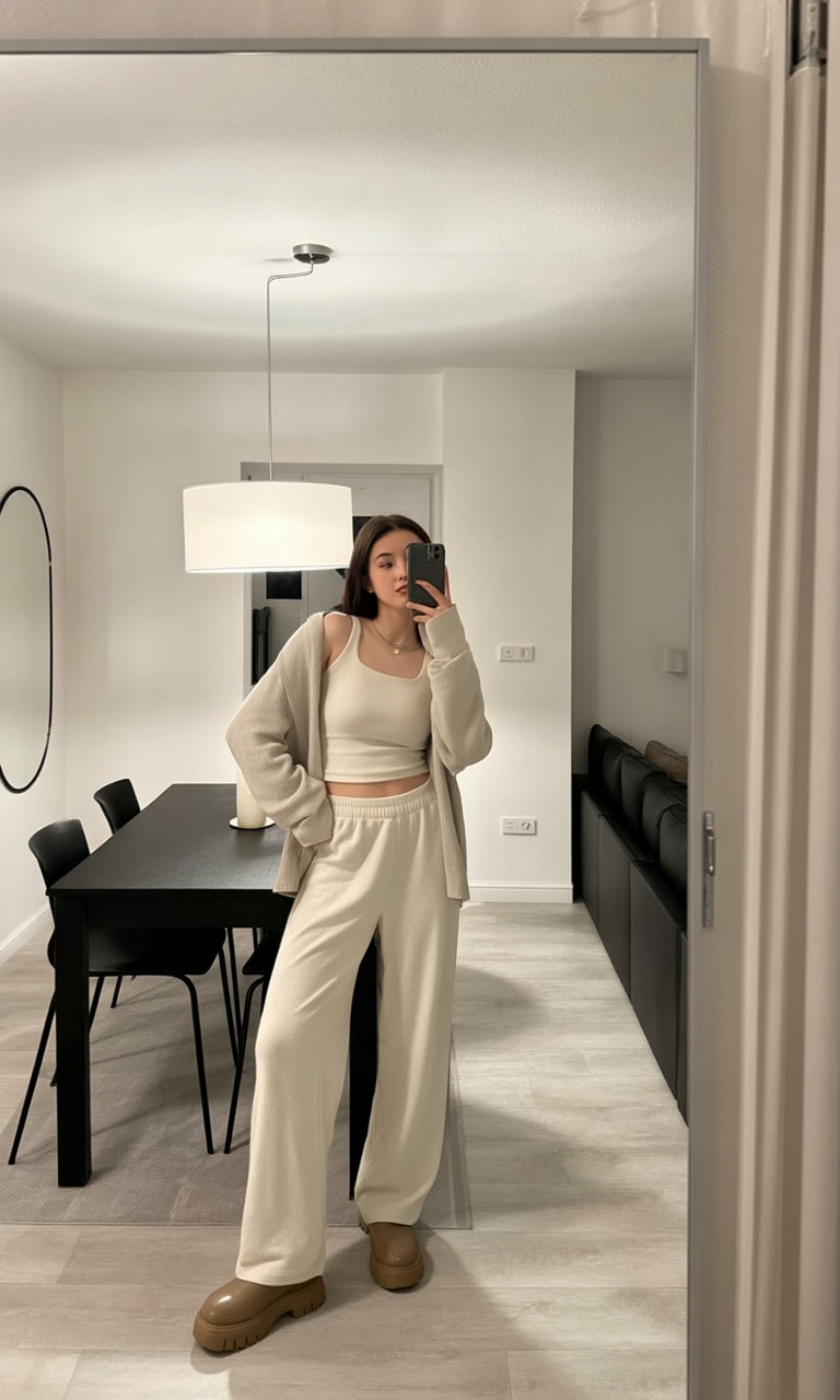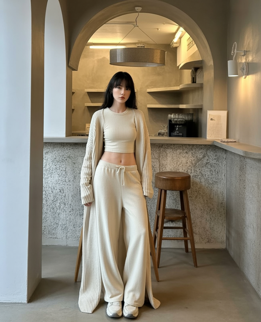 This outfit feels calm, grounded, and quietly stylish. The neutral tones and soft knit textures create a soothing, aesthetic look that feels perfect for slow mornings or quiet afternoons. It’s subtle, not showy, but still makes you feel pulled together in a way that feels natural rather than forced.