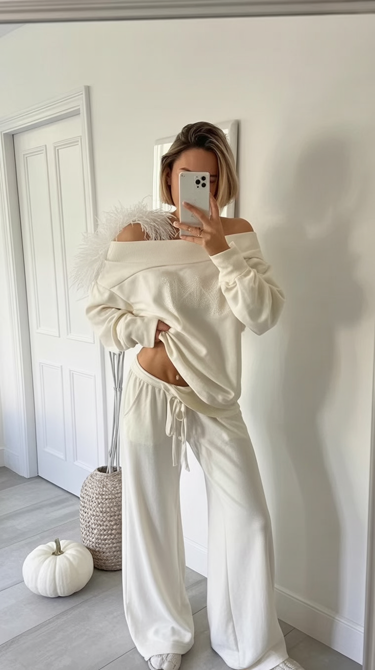 There’s a flirty softness to this look that feels relaxed but not boring. The off-shoulder detail brings a hint of personality, making the outfit feel a little more special than your average lounge set. It’s cozy, cute, and has that effortless aesthetic that works beautifully for quiet weekends, casual get-togethers, or even a low-key party where comfort still matters.