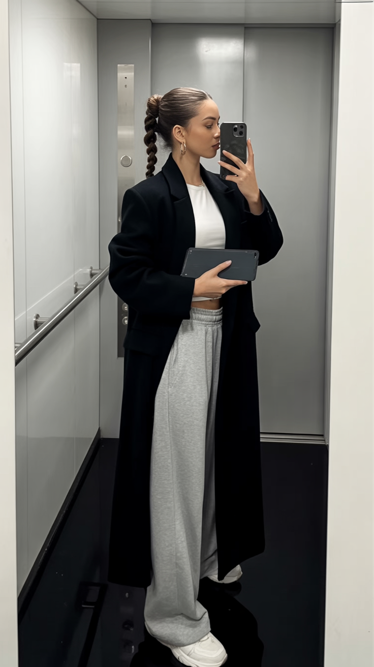 This outfit has that effortless city confidence that instantly elevates a casual base. The structured coat layered over soft lounge pieces creates a contrast that feels modern and intentional, like you’re blending comfort with polish on your own terms. It’s the kind of look that makes sweatpants feel acceptable beyond the house, perfect for busy mornings or quick meetings where comfort still matters.