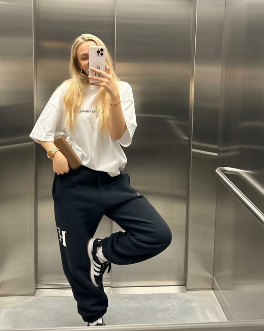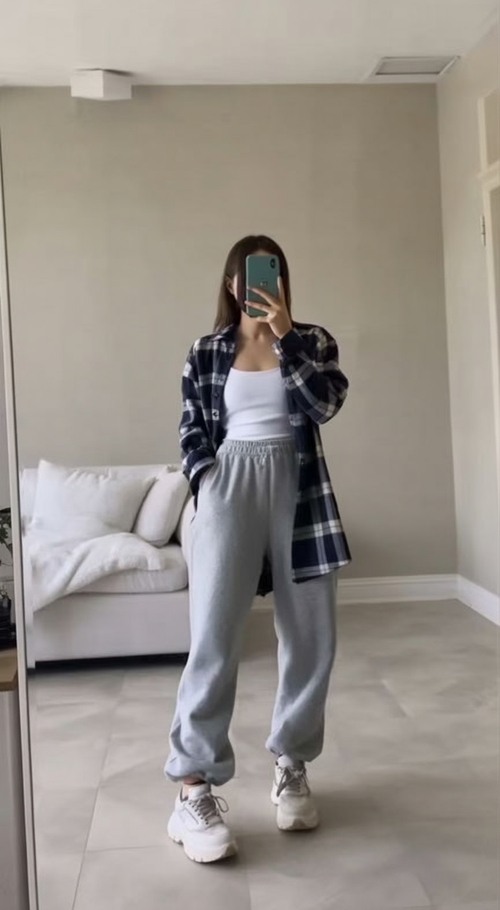 This look leans fully into relaxed confidence. An oversized tee paired with classic sweatpants gives off a cool, no-pressure vibe that feels honest and real. It’s the kind of outfit you reach for when you want to be comfortable and don’t feel the need to impress anyone—perfect for lazy days, quick errands, or casual hangouts.