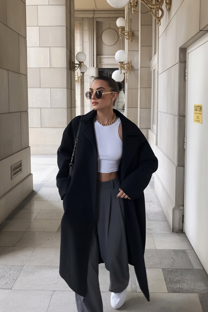 This look has that cool, confident city vibe that feels timeless and modern all at once. The long black coat brings drama and structure, while the relaxed layers underneath keep the outfit grounded in comfort. It’s the kind of style that makes you feel powerful but still completely at ease—perfect for walking through the city with purpose and calm.