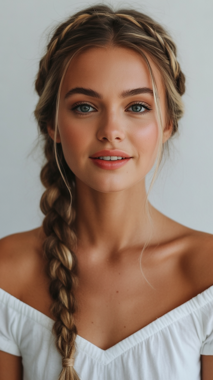There is something deliciously fairy tale about this crown braid and it sweeps round the head and relaxes into a long loose plait. It is every type of look that suggests sophistication but all that is accompanied with a flair that hints at a playful and youthful-vibe all at once perfect whether it is on a weekend brunch or a beach day or even a casual wedding event. The air of romance is present strength one does not take too seriously with its soft hair that frames the face and a slightly disheveled texture.