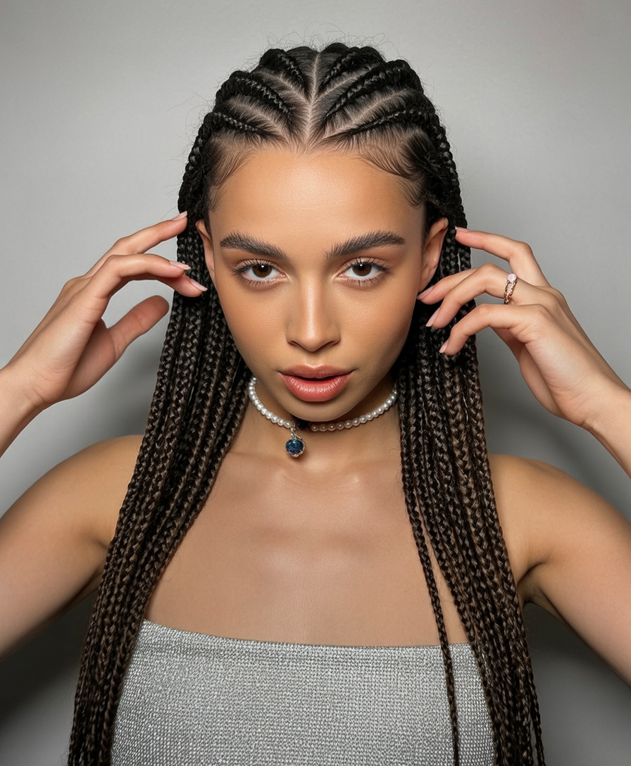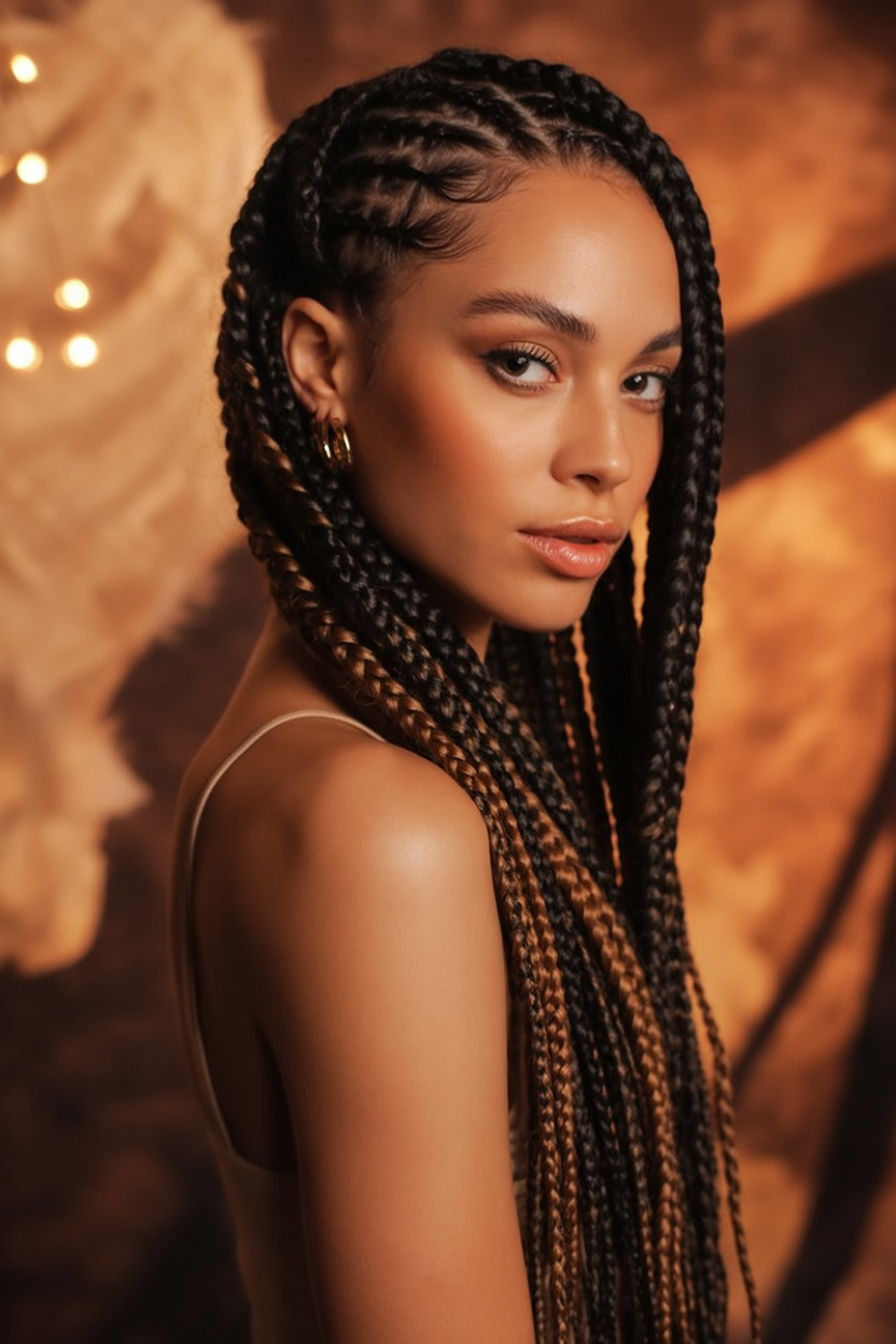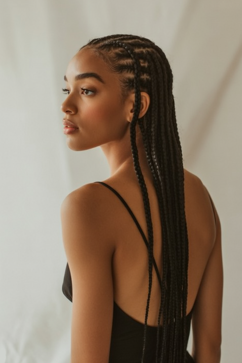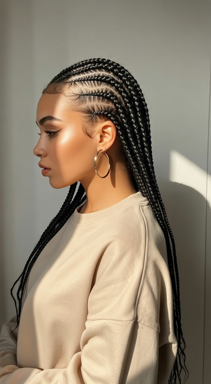 This hairstyle is a marriage of side-brushed stitch all cornrows precision and the carefree innocent beauty of unplanned braids. There’s something undeniably modern about it — like you’re effortlessly tuned into 2025 style without trying too hard. The braids tuck in without any trouble and allow your bone structure to show and the length gives it that effortless drama.