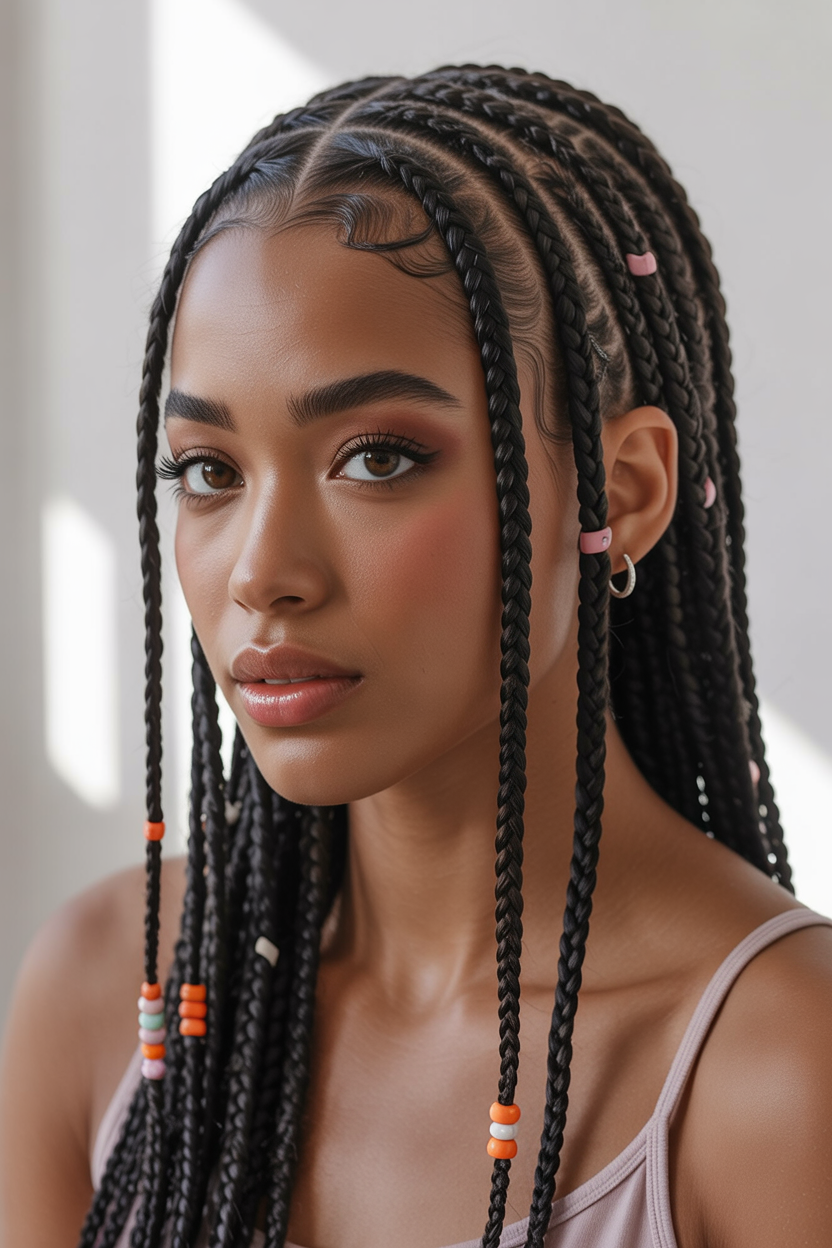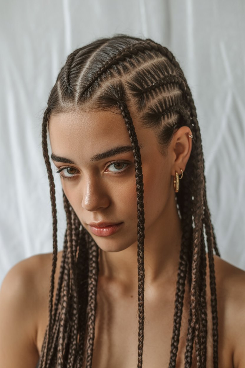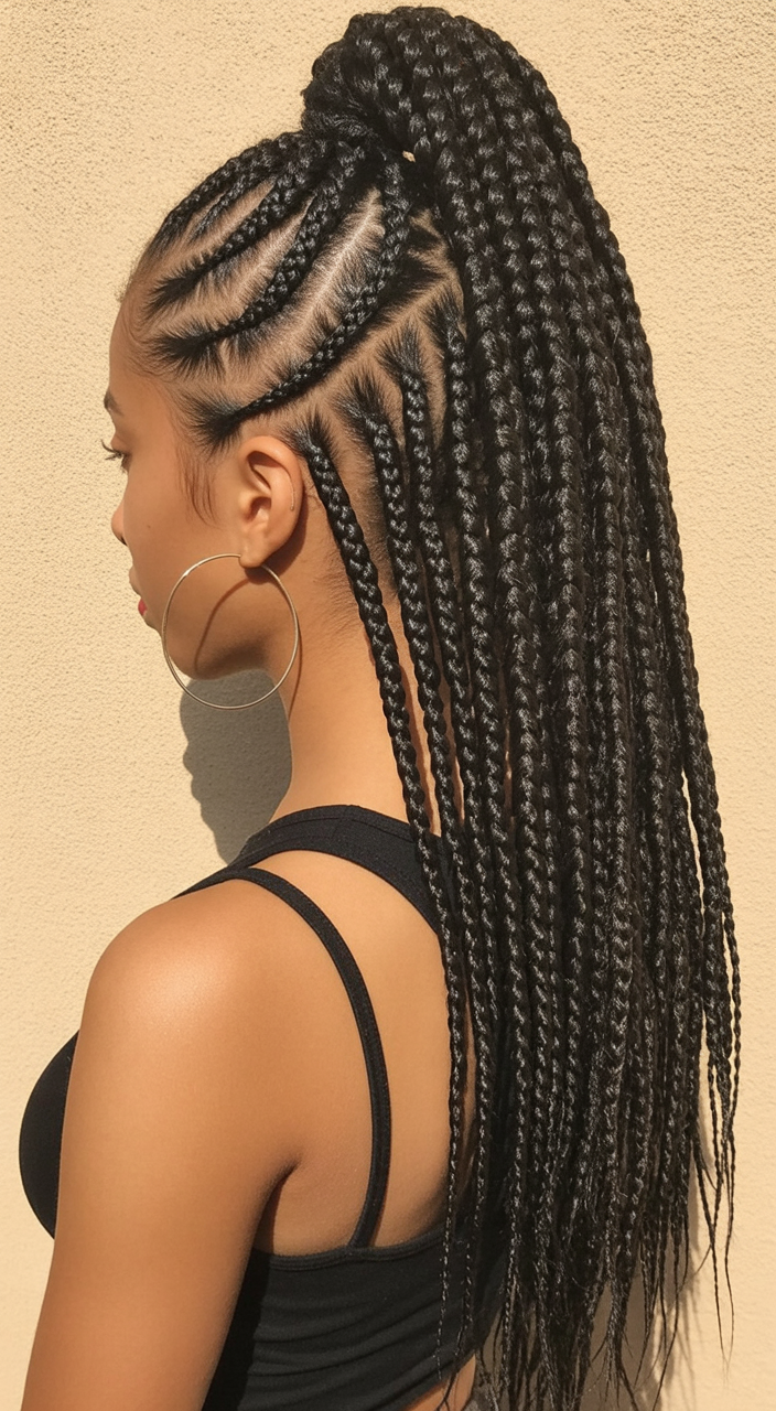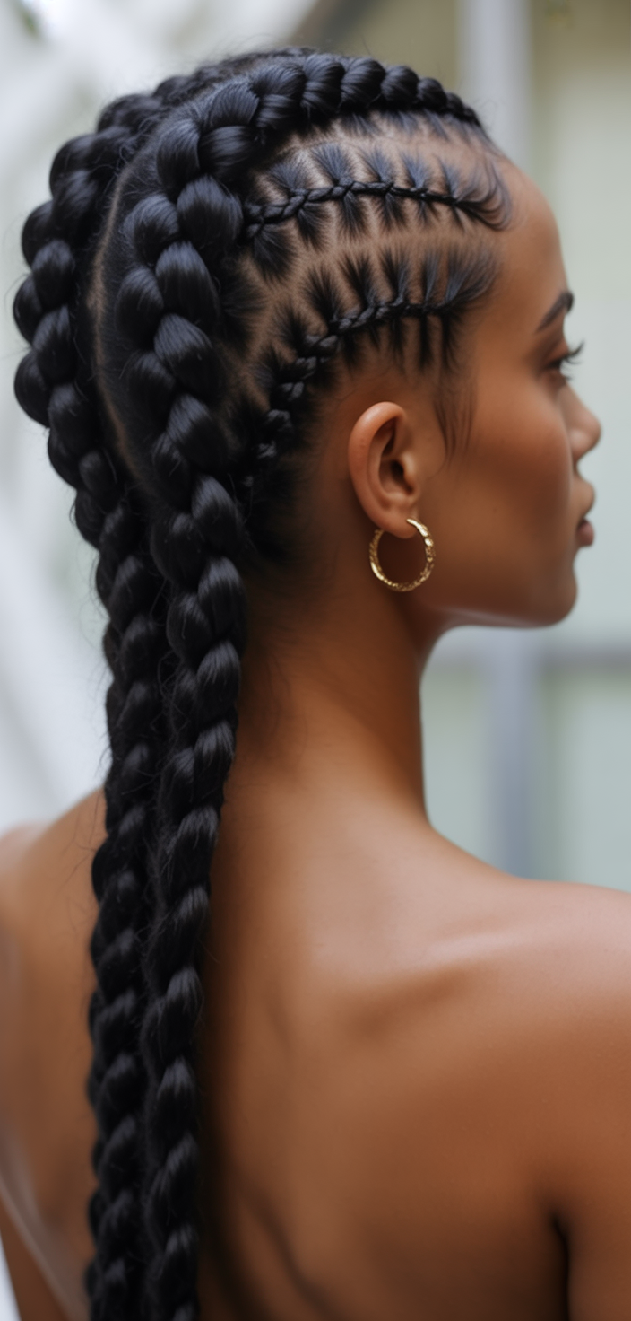 This hairstyle is a marriage of side-brushed stitch all cornrows precision and the carefree innocent beauty of unplanned braids. There’s something undeniably modern about it — like you’re effortlessly tuned into 2025 style without trying too hard. The braids tuck in without any trouble and allow your bone structure to show and the length gives it that effortless drama.