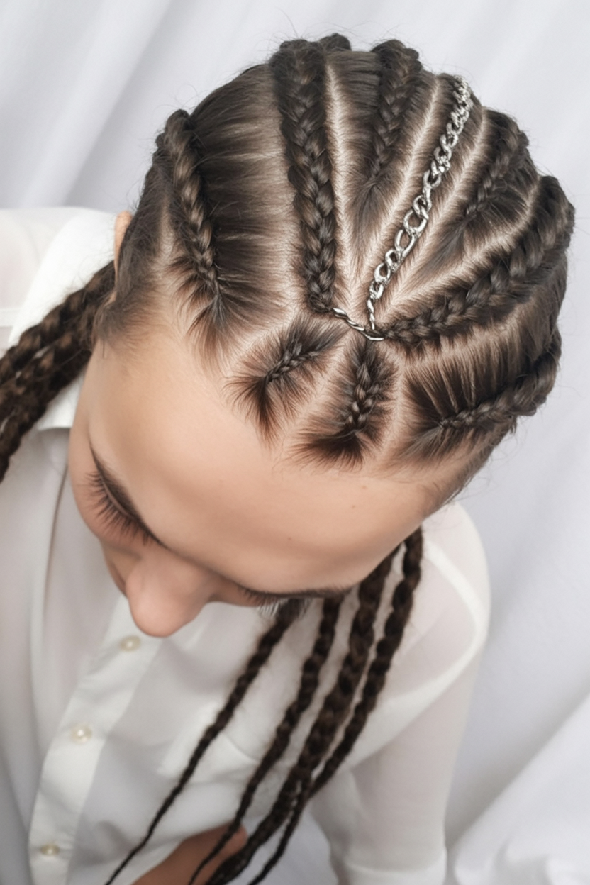 This edgy take on cornrows brings all the personality. There is zigzagging section and segments of tight braiding, just like in a Zindagi Milegi Dobara kind of pattern but this one young and full of attitude because it has that chain run through it to add a bit of shine and a hint of spice. It’s daring, sure, but not over the top. Think street-chic meets sculptural hair art.