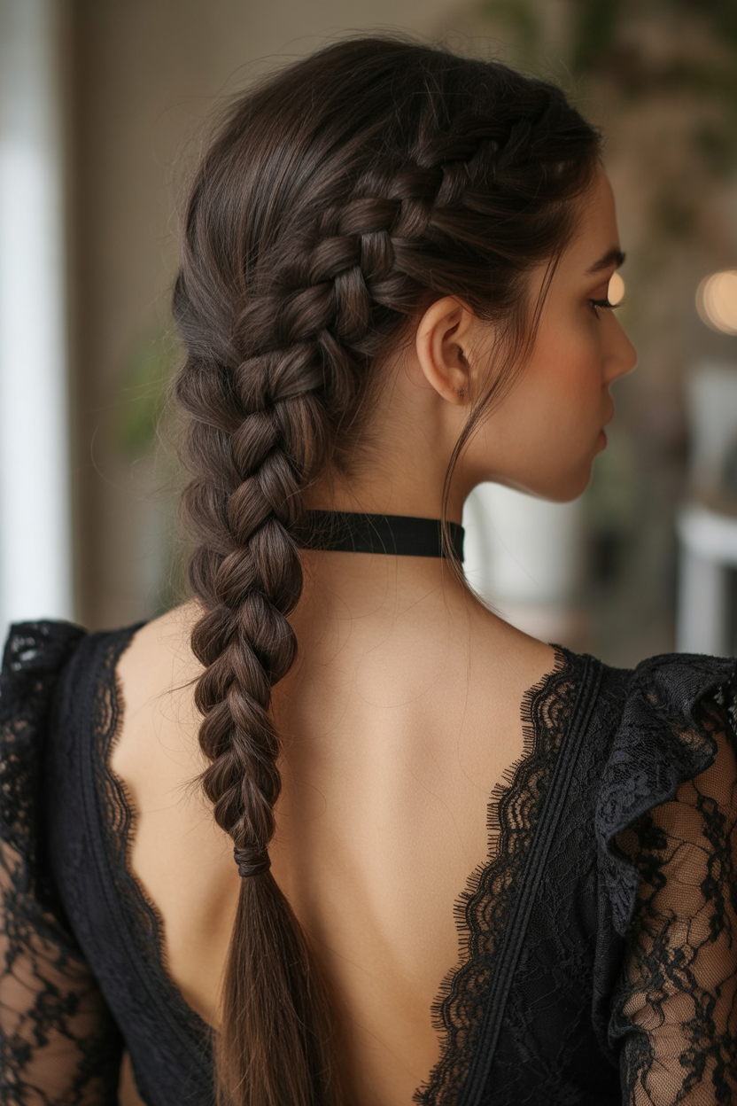 The vintage-feeling of this classic Dutch braid cannot get any hit or miss by jumping into the right direction because it is so clean and symmetrical and yet it has that elegance of simplicity. It is the type of classic design which goes with lace, leather, or on your favorite jeans. Throw in that delicate choker and immediately the entire outfit takes on a dramatic bent, a suggestion of 90s cool.