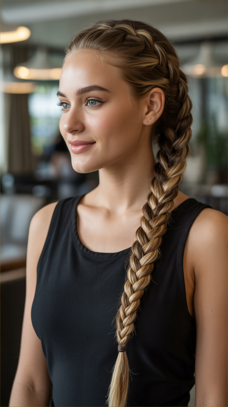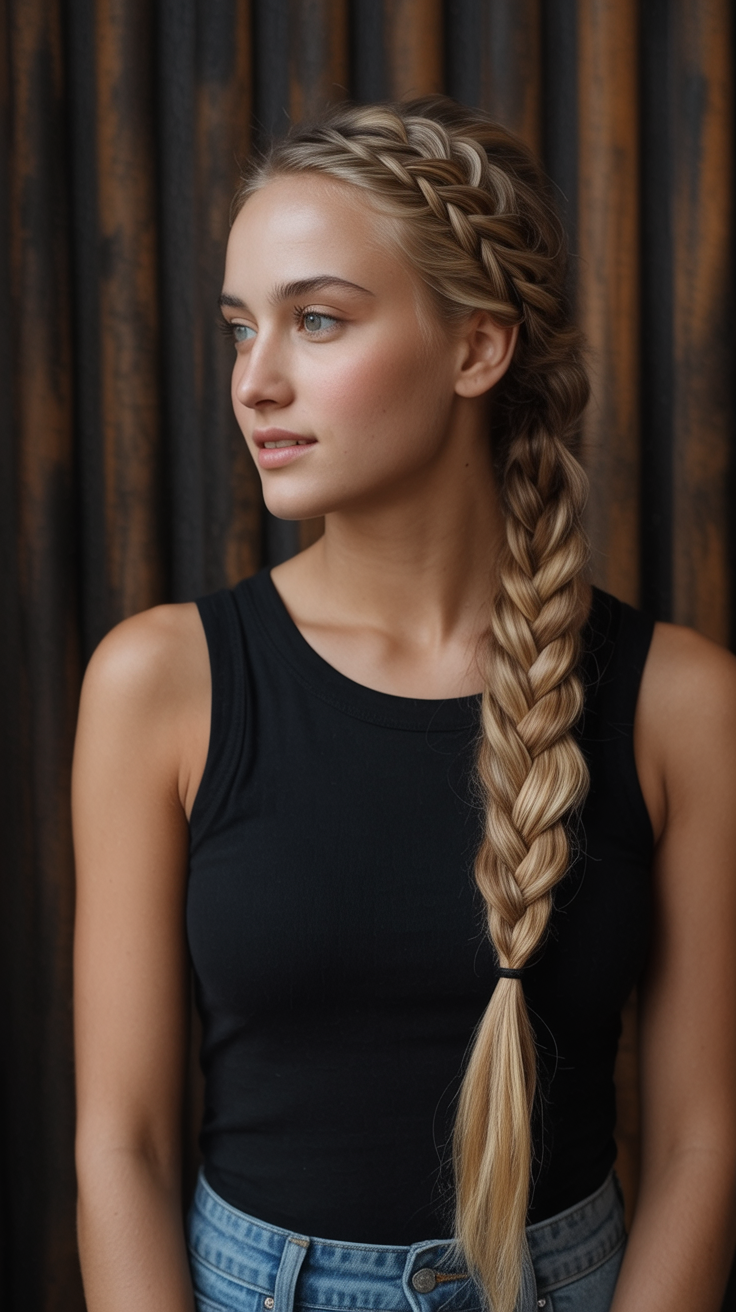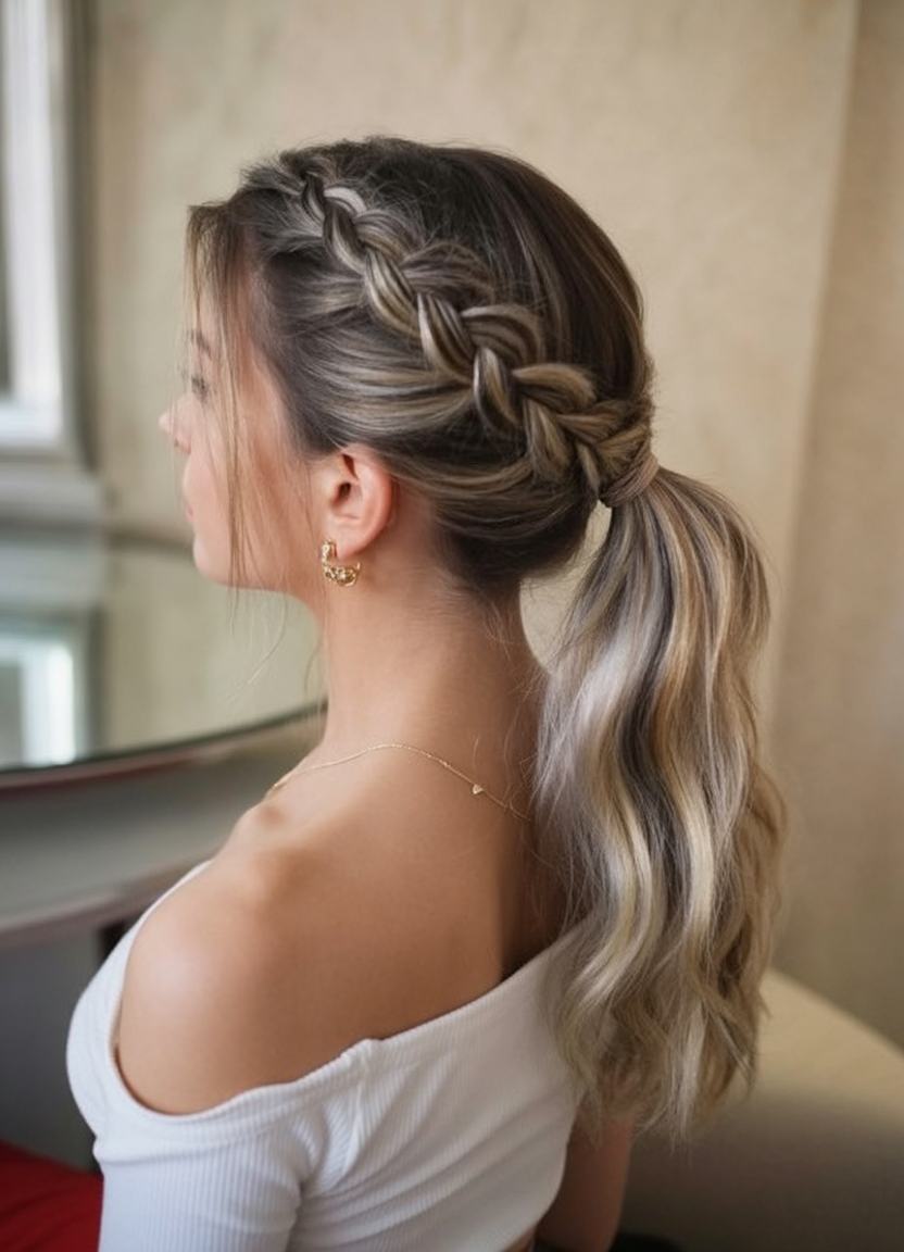This soft, swept-back braid is the kind of hairstyle that says “I’ve got my life together” — even if your to-do list is miles long. The style is anchored by the crown braid and remains light-hearted because of the ponytail. It feels youthful, polished, and completely adaptable.