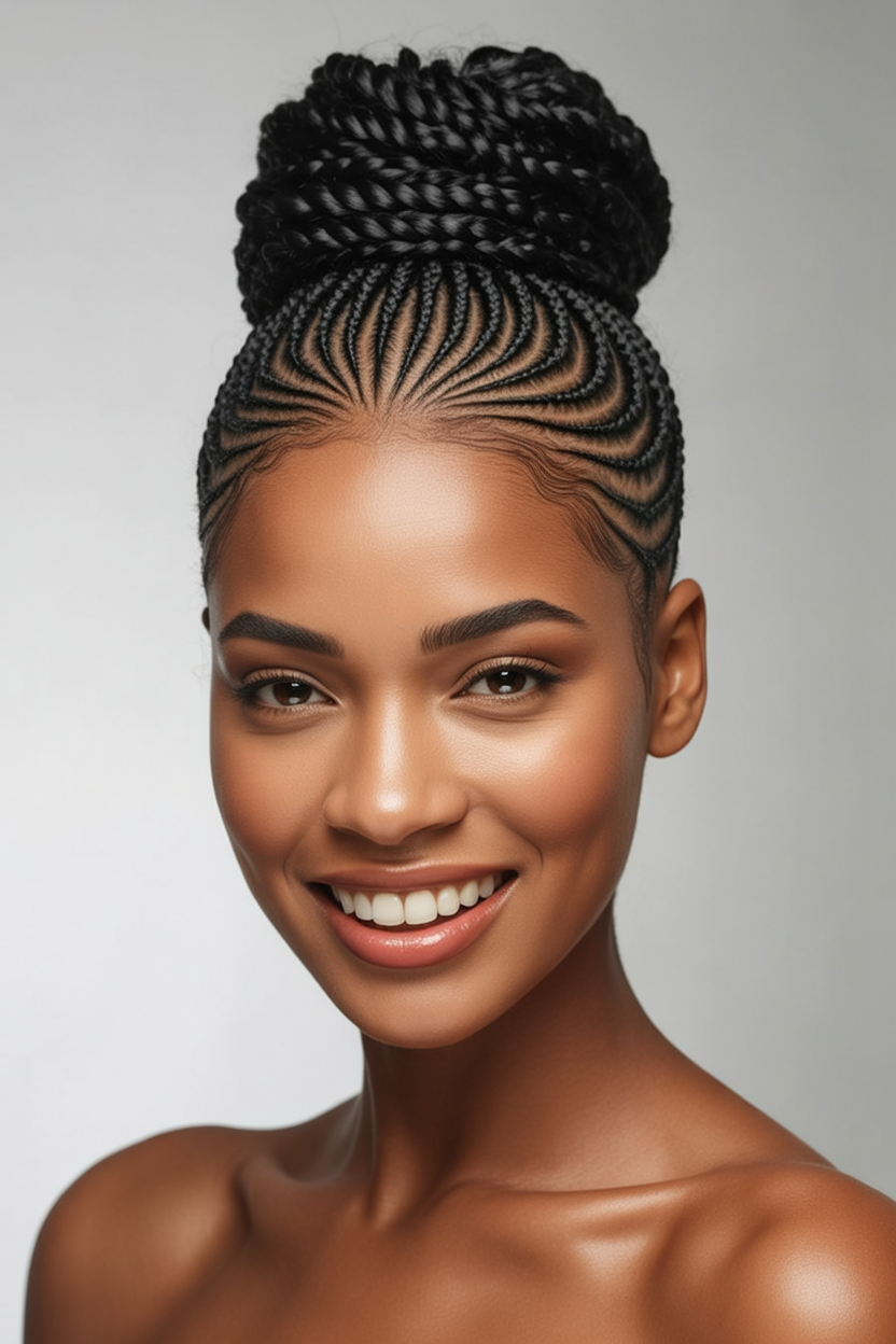 This is elegance with an edge. The hairline dazzles with the image of sunrays bursting into the cornrows, that are wound into a tight braided bun that would make any monarch jealous. It is clean, orderly, and funky at the same time, but it has the statement quality that does not feel unwearable.