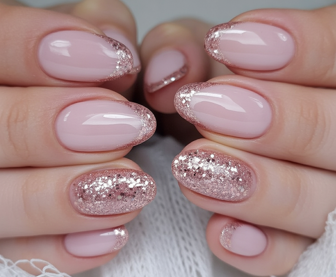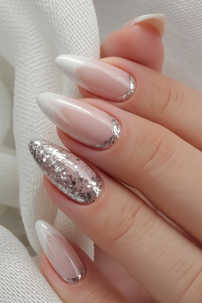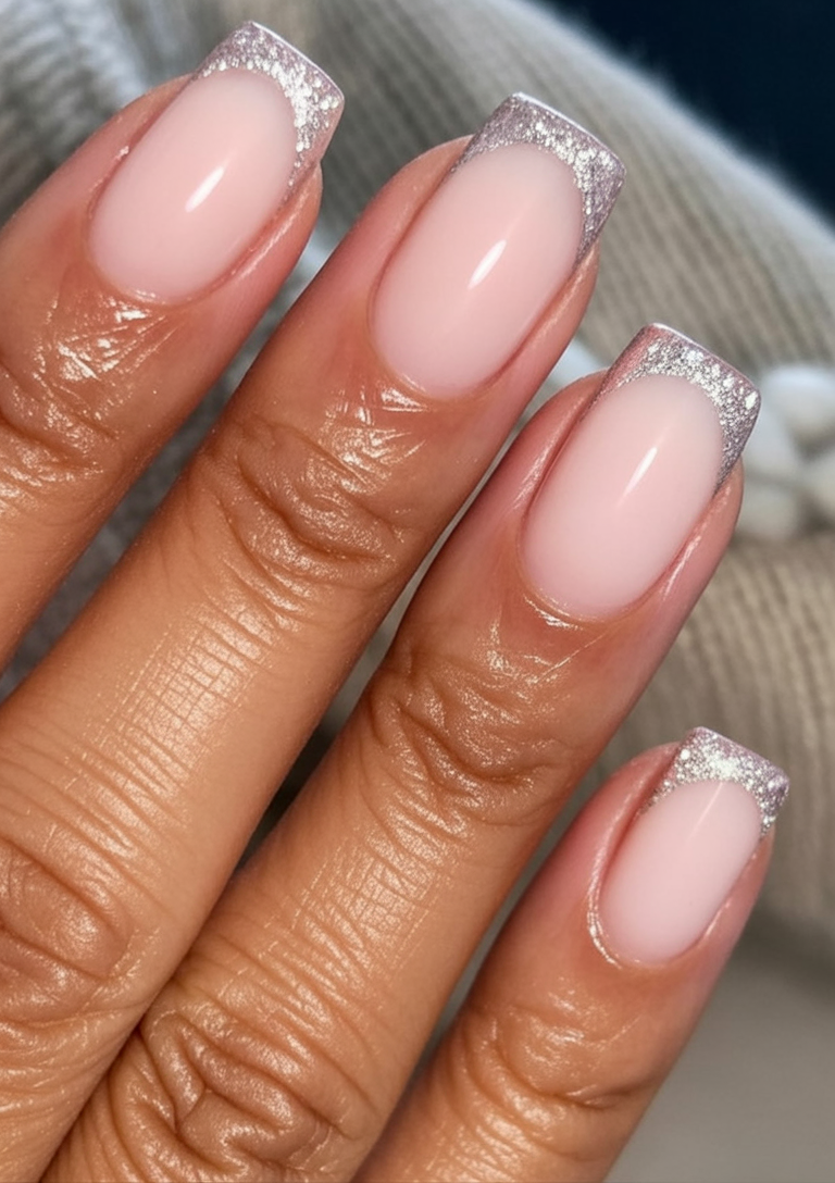 Silver tips on classic French nails are a glittering 2025 update that are both vintage and current. The feminine look is maintained by the soft blush pink base and the glitter trim provides it with that extra lift- like jewelry on your fingertips. It is a simple method of adding glamour but not to the extreme and so it suits all occasions.
