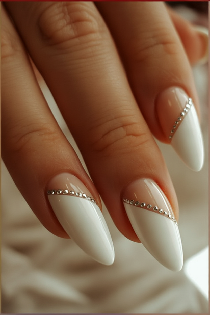 These stiletto nails are bold and sophisticated and will make the inner diva shine through in the most elegant manner. The white polish is crisp and the silver gem accents are delicate giving it a daring yet elegant look. It is the type of manicure that might transform an ordinary outfit into a runway outfit.