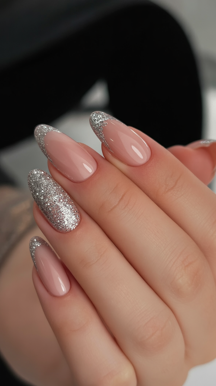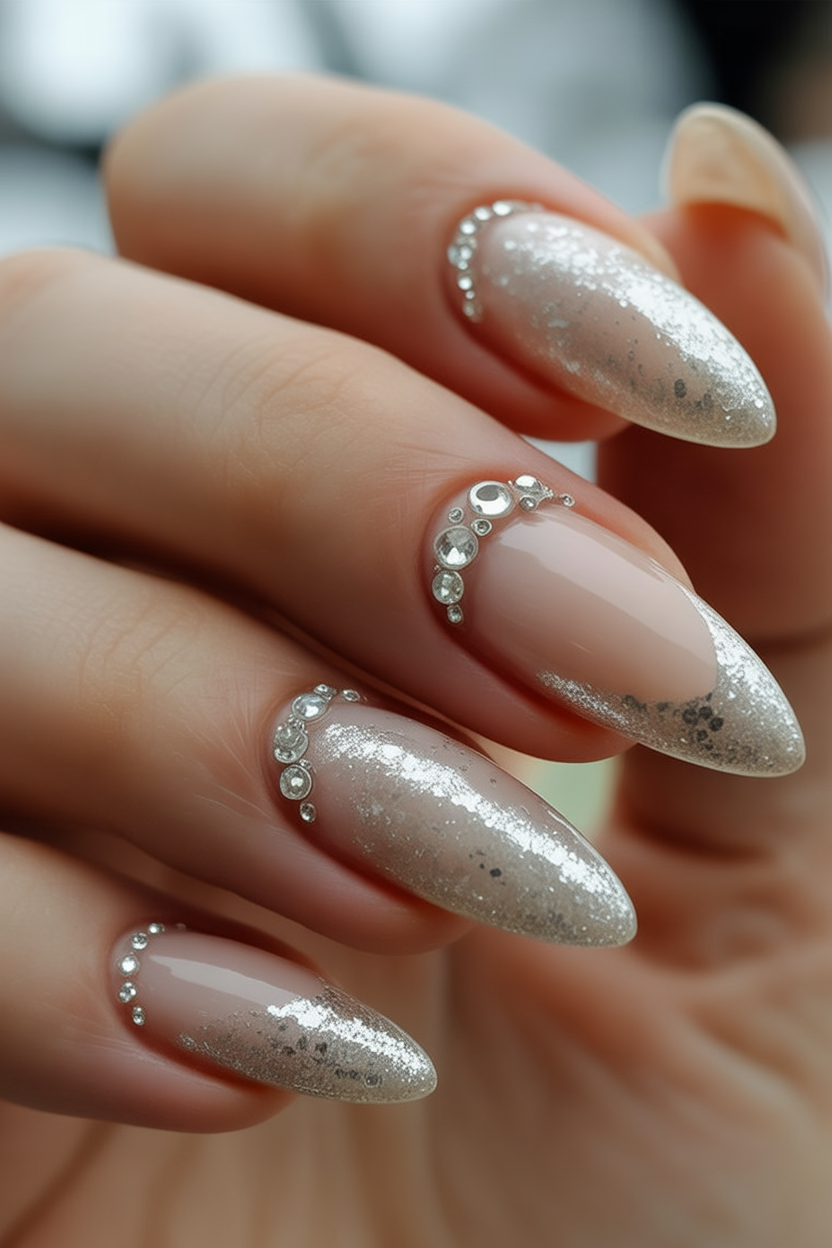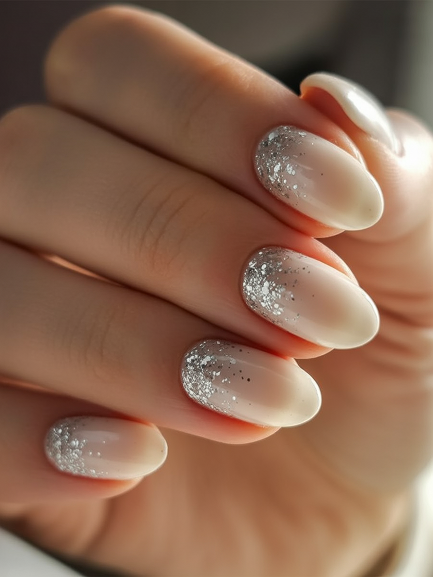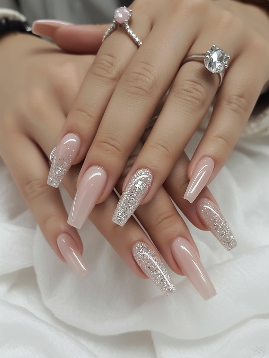 Here is a manicure that speaks of luxury. The skin-color nude base is paired with glittering silver accents, which make the entire appearance resemble champagne fizz in the sun. It is glam but not too glam, smooth and glamorous without being too loud.