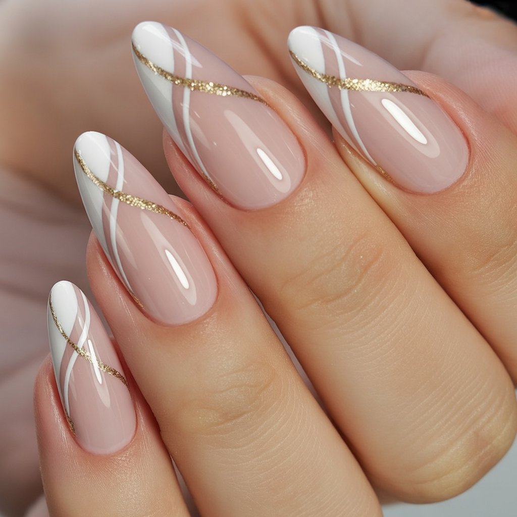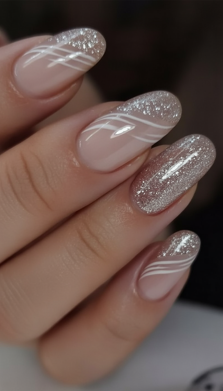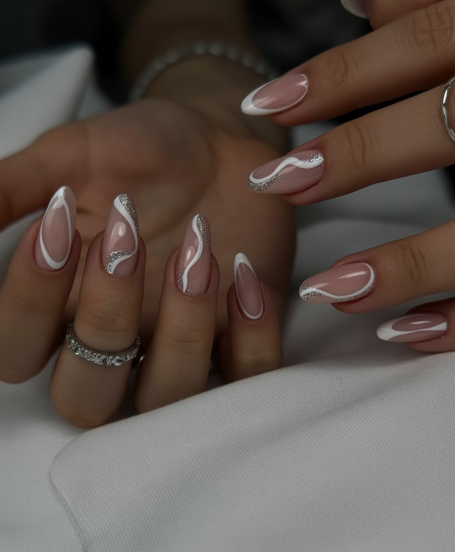 This design is movement and flow based, with swirls of white mixed with glitter streaks to add artistic appeal. It is also playful and polished as though your nails are playing with light whenever you move your hands. It is the type of glance that makes a plain outfit to feel immediately fashionable.