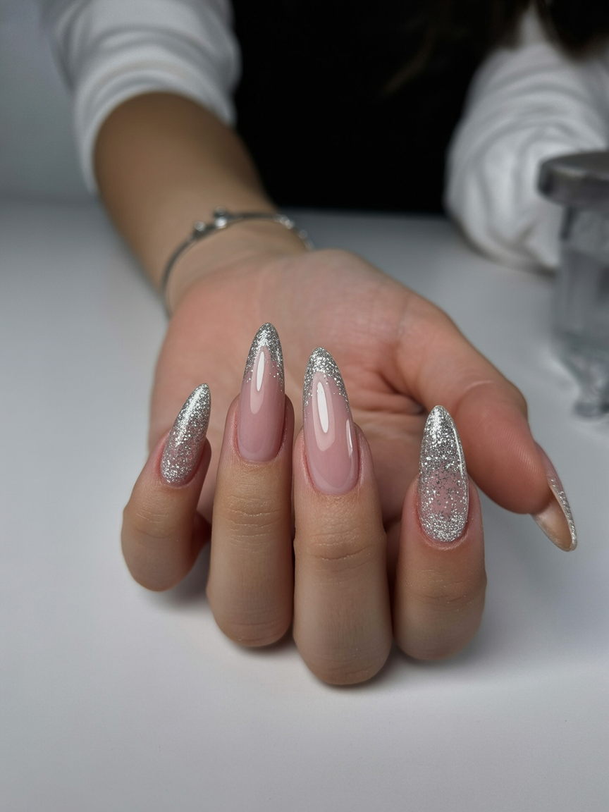 This airy soft nude manicure is refreshing and light with silver glitter tips. The glitter resembles snow on a winter morning, tiny, sunny, and elegant. It is subtle but still celebratory, ideal to be worn on a daily basis in the colder seasons.