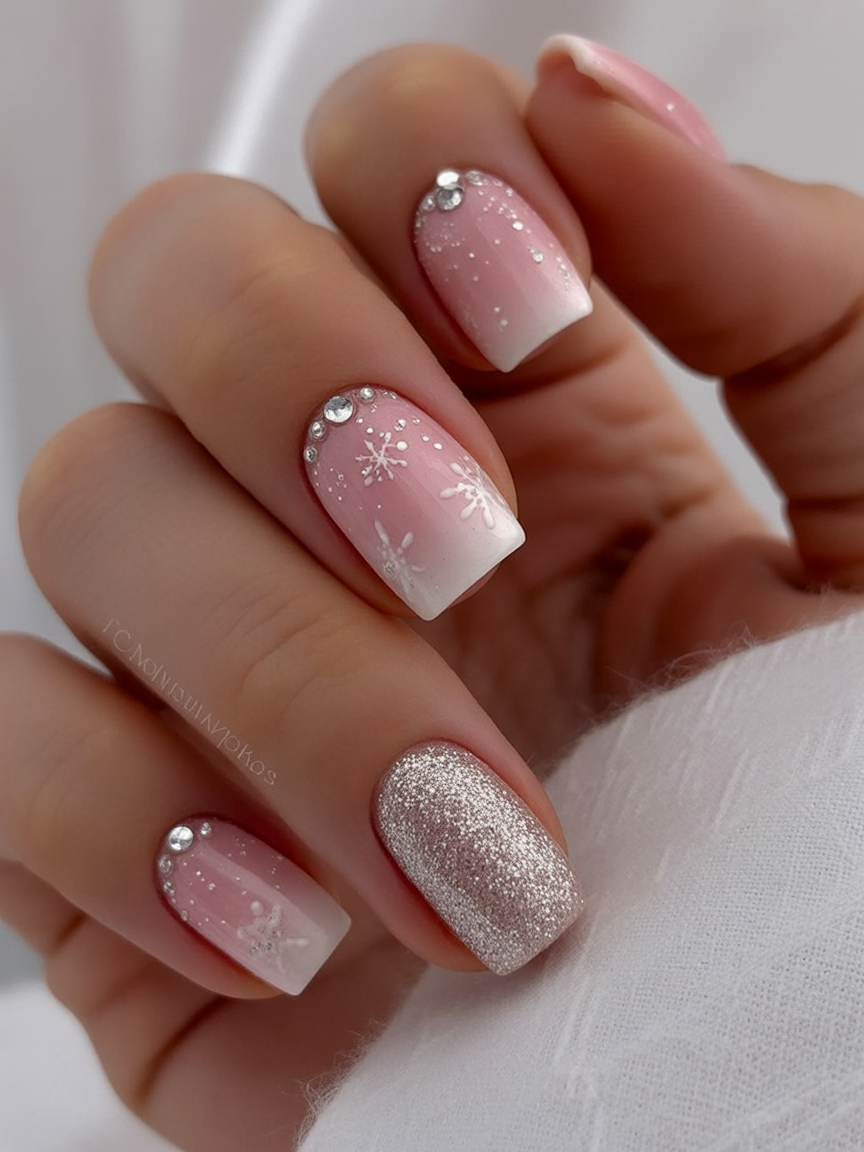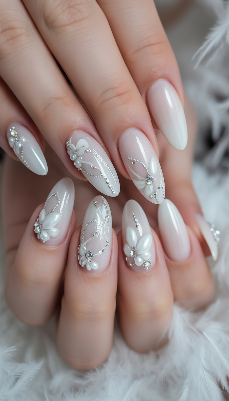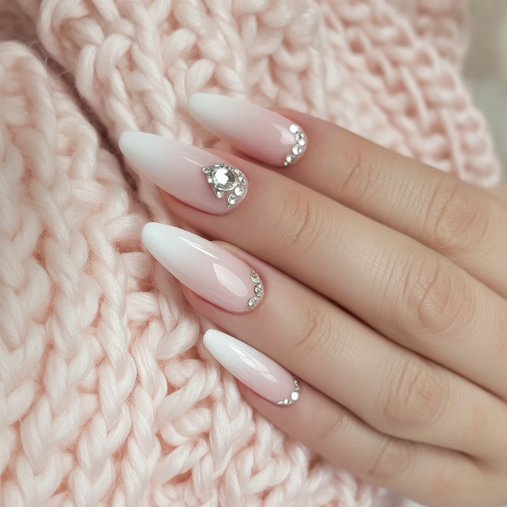 In this sophisticated style, classic ombre is combined with a bit of glitter. The pink-to-white soft fade forms an eternal foundation, and the rhinestones bring a crown-like shimmer. The ideal wedding dress or any other person who loves a classy, elegant design with bling to the right amount.
