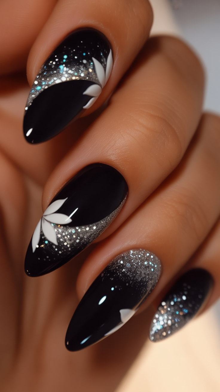 There is something so dramatic about black nails with silver sparkle kisses. The flowery decoration turns this manicure into a night garden with stars – bold, mysterious and elegant simultaneously. It is a gaze that suits women who like to combine power and gentleness.