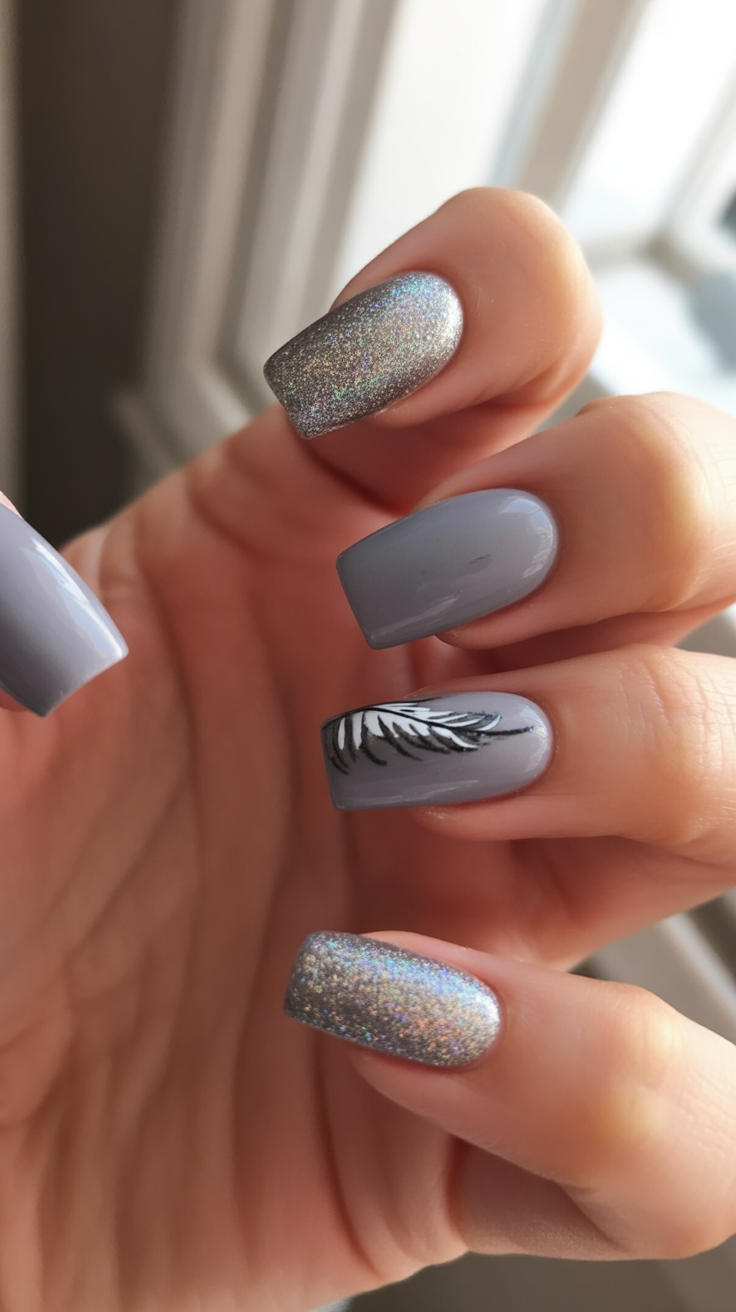 This combination of gray polish and holographic glitter is a new spin on silver. The feather is an artistic touch and the nails appear as a canvas of contemporary beauty. It is artistic yet not too conspicuous to wear on a daily basis.