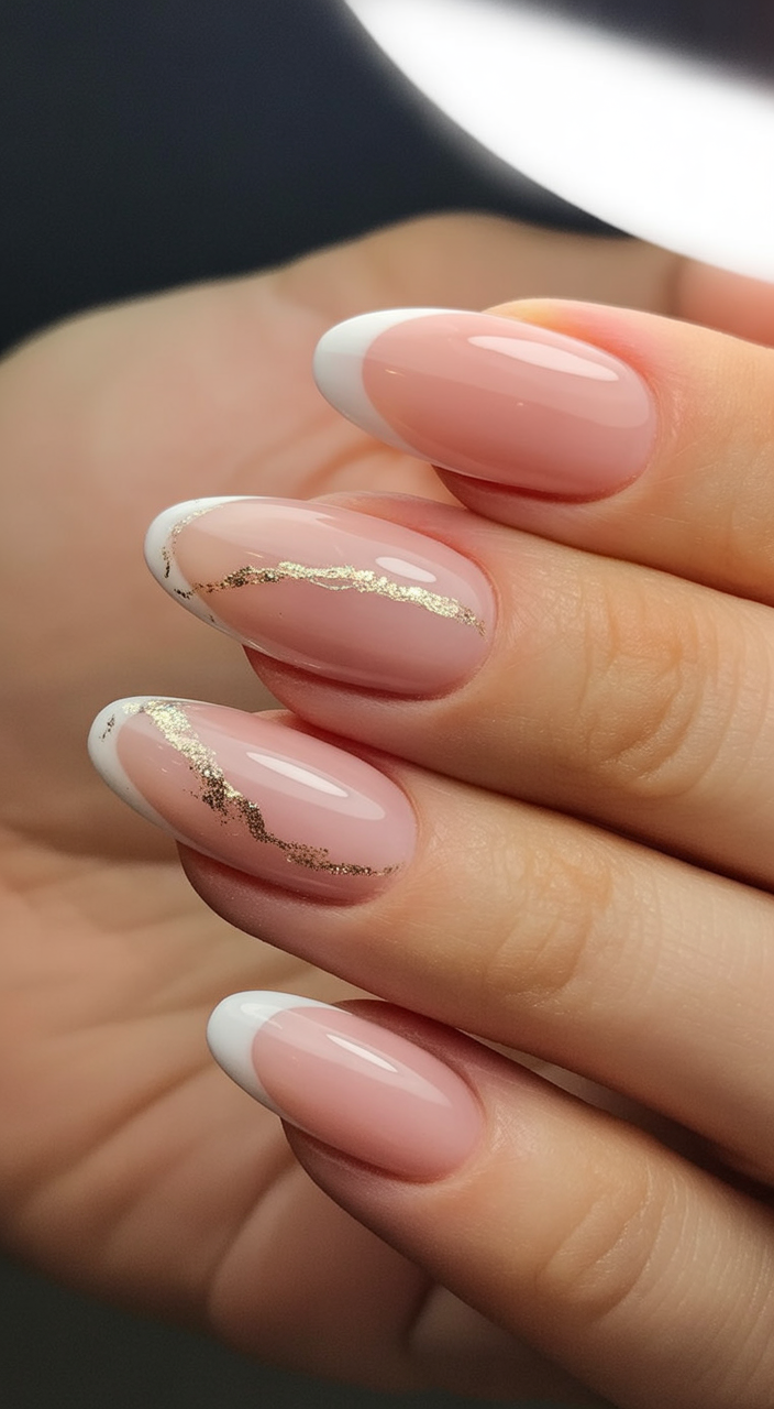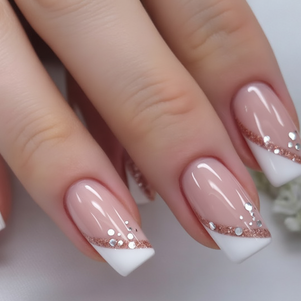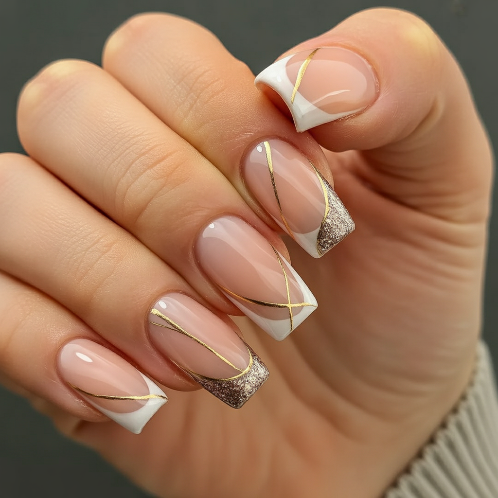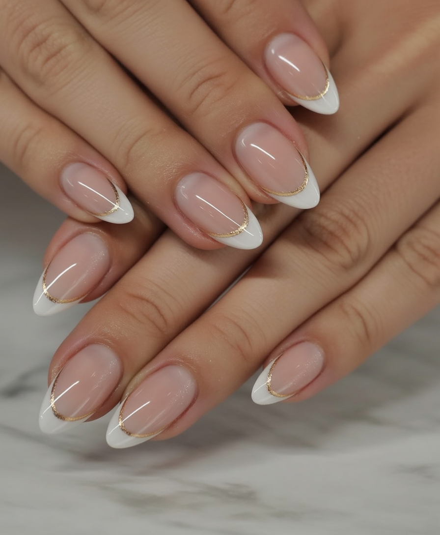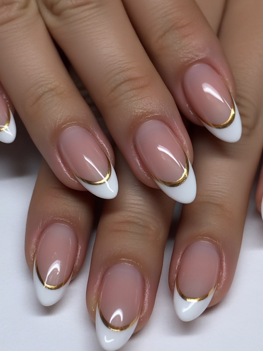 Classic French with a splash of modern glam, this design does not disappoint. The milky nude base keeps it soft and natural, while the gold line elegantly defines each white tip — a perfect balance between sophistication and sparkle. It’s the kind of manicure that feels timeless but far from boring.