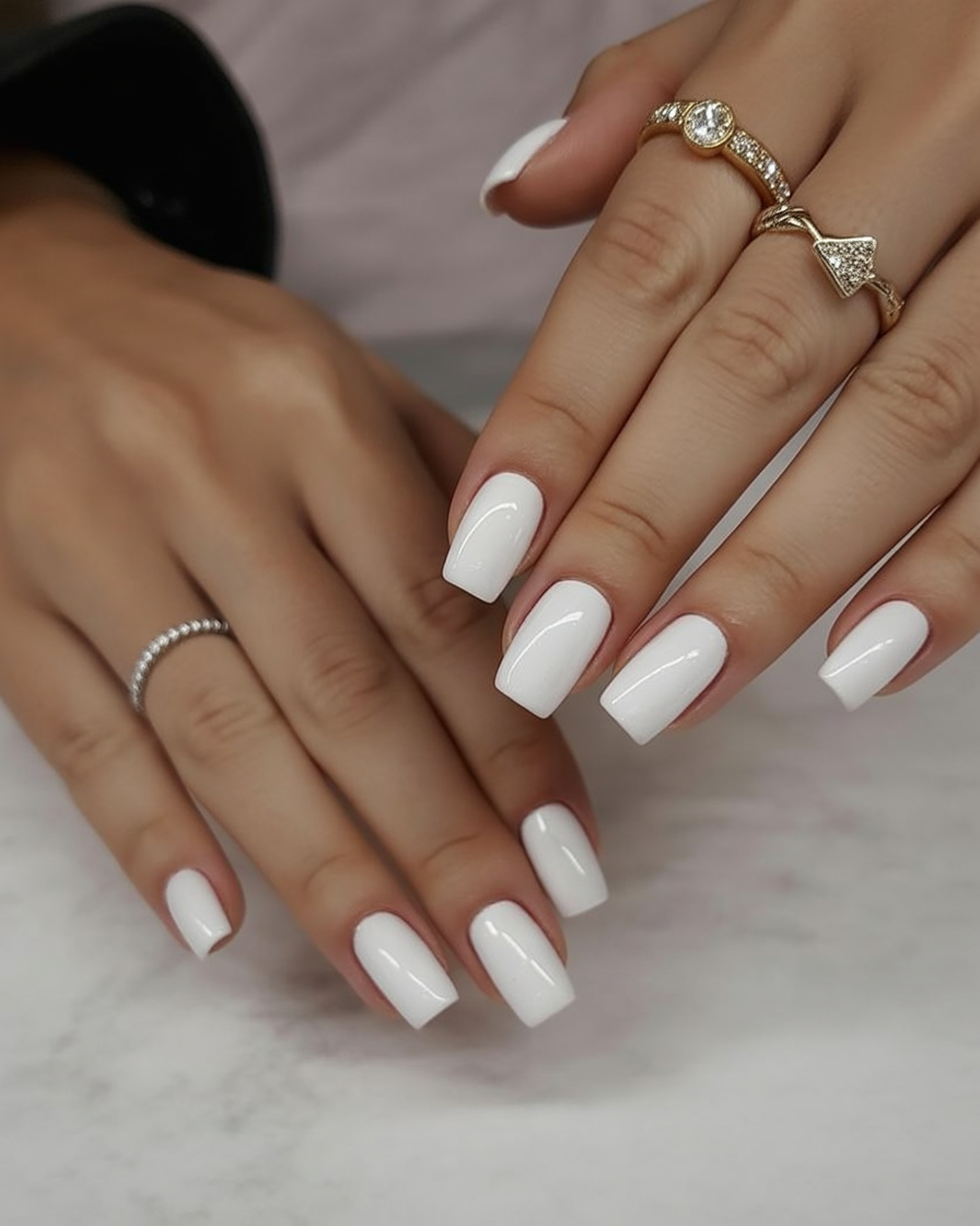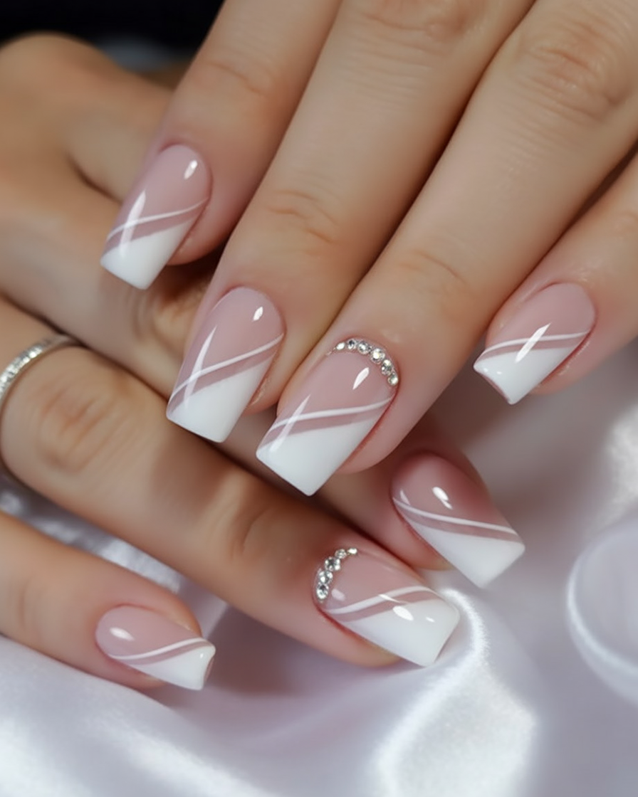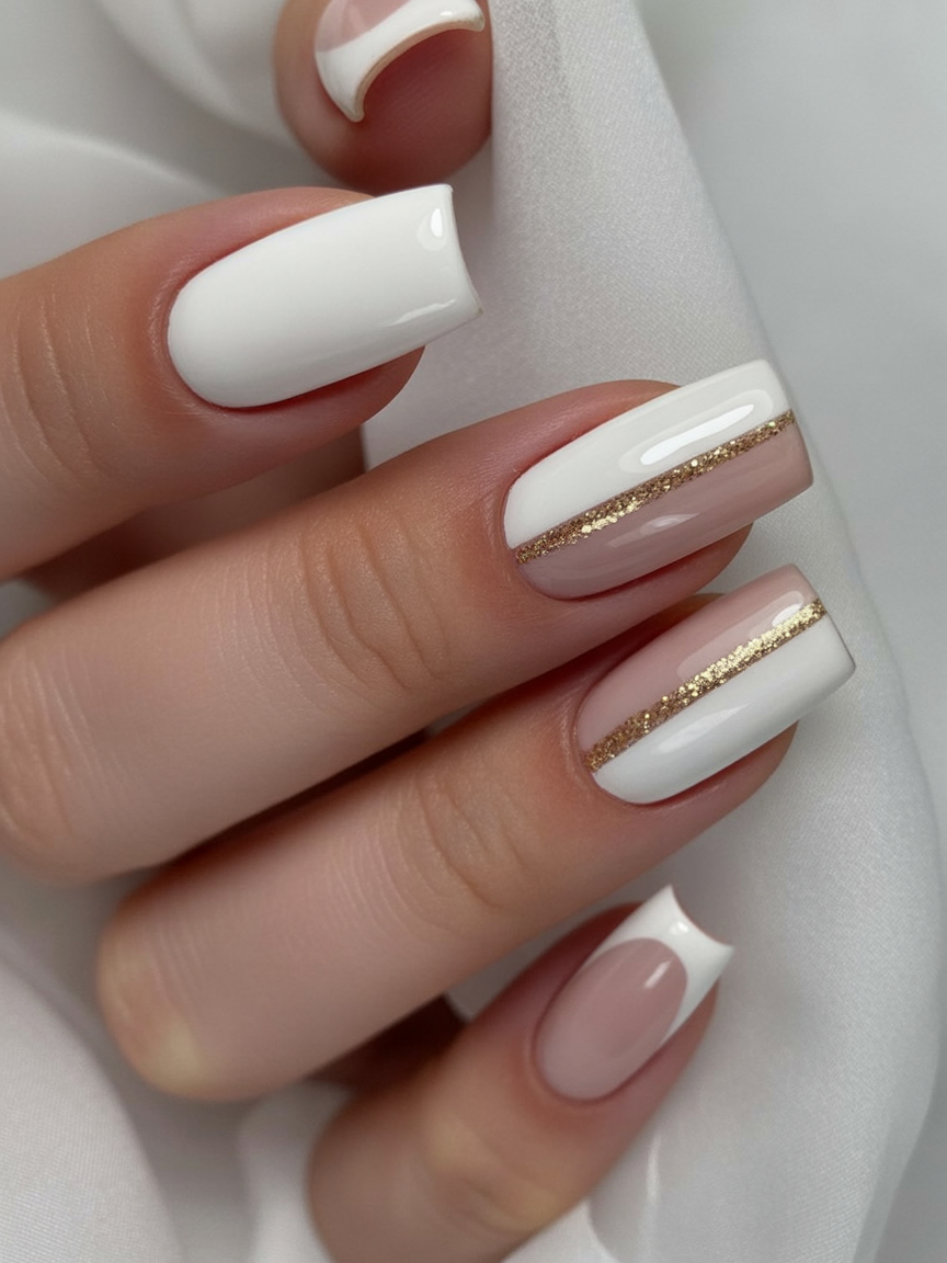 Best suited for short to medium square nails, this look flatters any skin tone. The glitter accents make it perfect for winter, while the clean lines keep it wearable year-round. Add a quick layer of clear top coat every few days to keep the shine fresh and your white polish crisp.