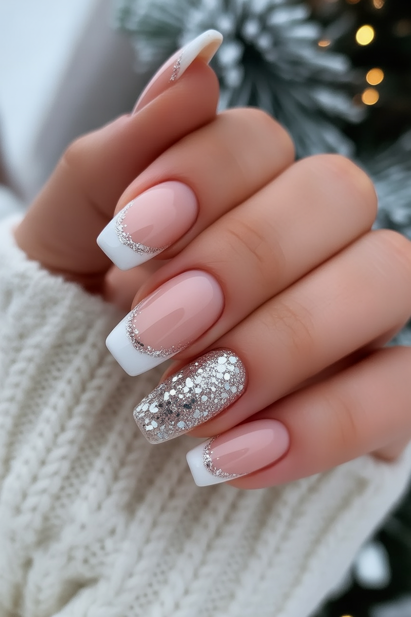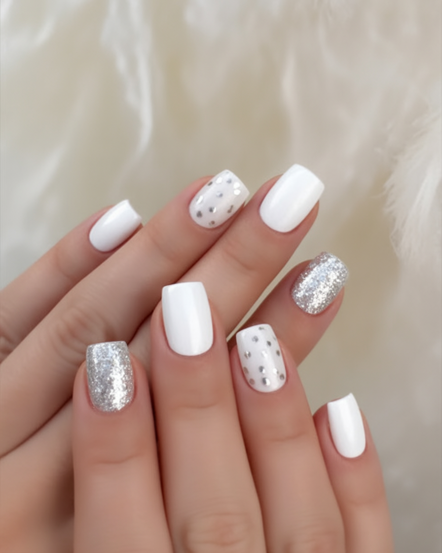 When you want something bold yet undeniably classy, these white and silver nails hit the mark. The mix of glossy white polish, sparkling silver glitter, and dainty metallic studs feels festive but still refined. It’s the kind of manicure that turns a simple outfit into something instantly polished — ideal for both holiday dinners and everyday confidence boosts.