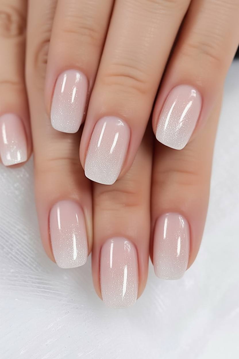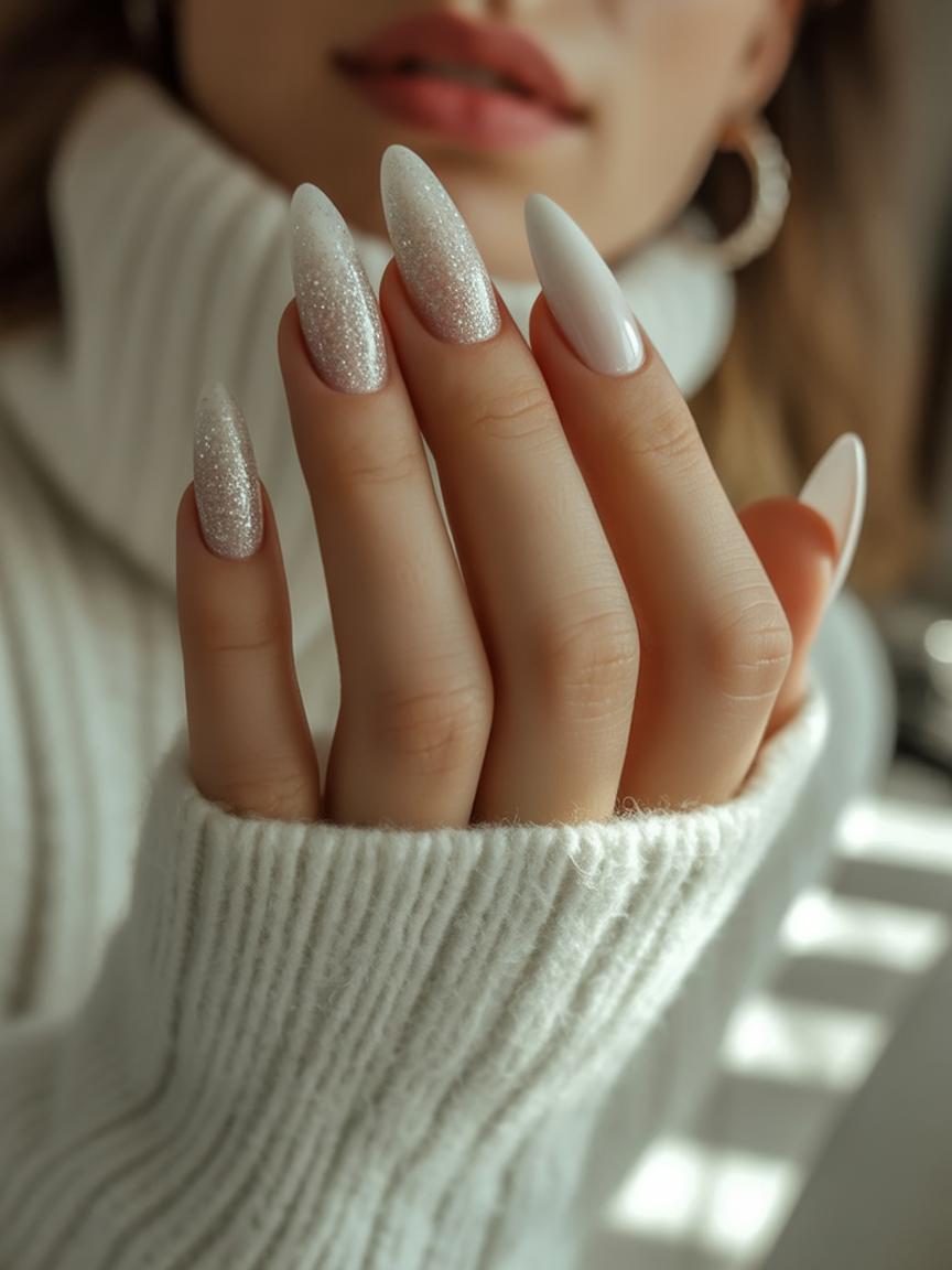 Soft, romantic, and oh-so-cozy-just like that pearly ombré feels like a snowy morning wrapped in a cashmere sweater. The milky white base fades lightly into glittery tips that sparkle with every gesture. It is elegance in motion: a touch subtle for the office and a hint glam for dinner out.