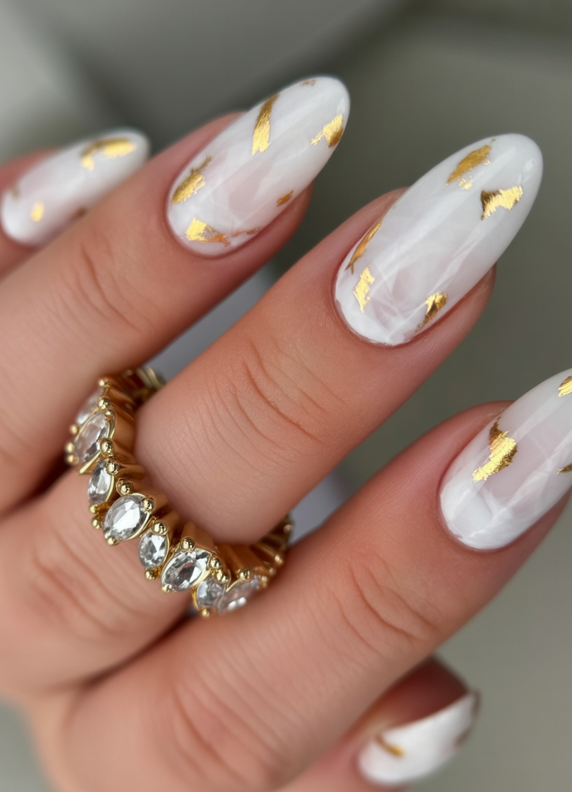 A true work of art — these white marble nails with gold foil accents combine luxury and creativity. The marbled texture mimics natural stone, while flashes of metallic gold elevate the entire design into something truly striking. It’s a sophisticated choice that feels expensive without being overdone.