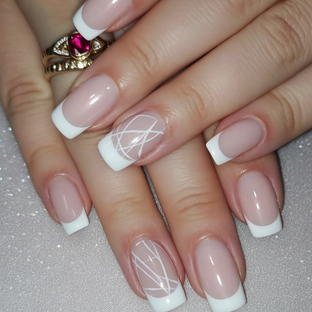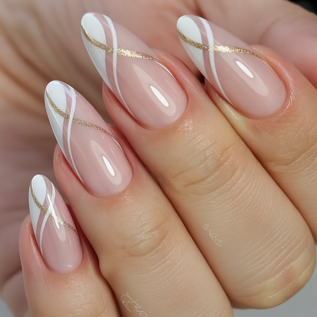 Elegant, modern, and graceful — these French nails are reimagined with flowing white and gold lines that create a soft, dynamic motion. The combination of clean white curves and thin gold strokes adds depth and luxury without overwhelming the design.