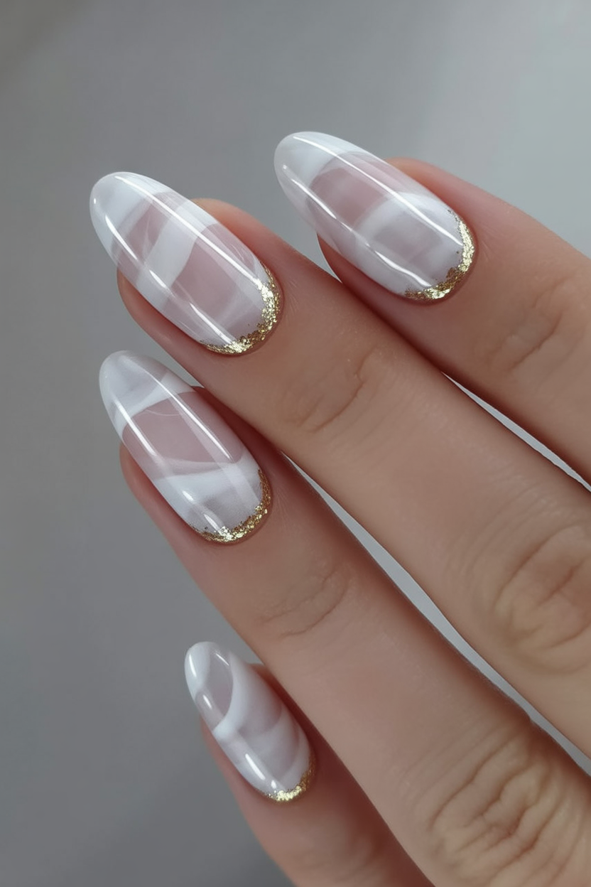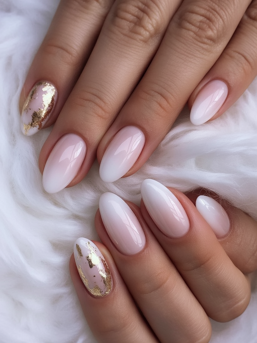 If you feel that elegance should strike some artistic note, this will become your choice. The milky ombre nails serve as a creamy backdrop for pieces of gold foil that seem like little shards of sunlight. It is intricate yet elegant-a superb melding of natural softness and rich texture.