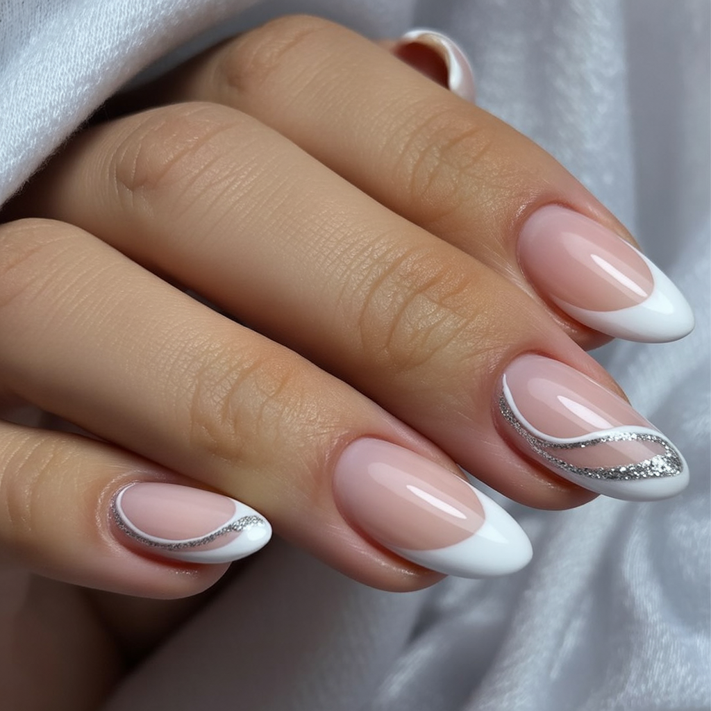 This look takes the classic French manicure and gives it a futuristic twist. The soft pink base and milky white tips are familiar, but the silver chrome swirl dances across the nail like moonlight on water. It’s modern, romantic, and a little mysterious — perfect for women who love their French with a side of sparkle.