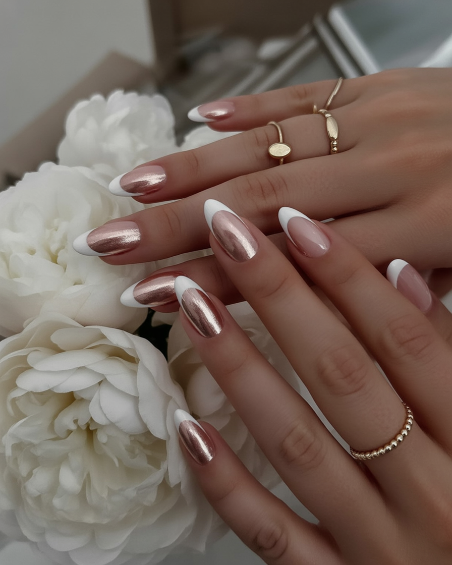 The nails essentially feel like jewelry. Every flip and movement catches light in the rose gold chrome shimmer, while the elegant white French tips firmly set down the look. It is a design that elicits refinement with a hint of playfulness. I want to say that holding a coffee cup or adjusting your sunglasses with these nails should immediately lift up the moment.