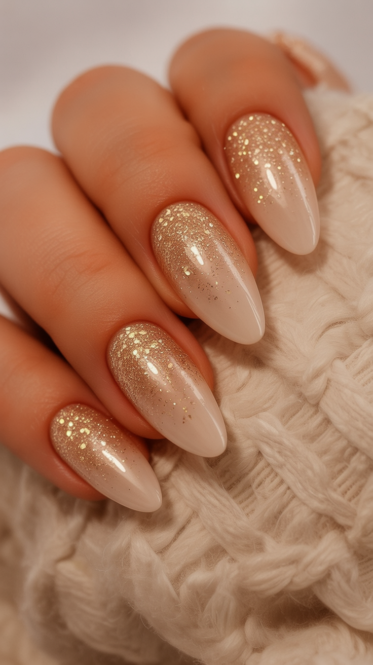 Such a look fits well with almond shapes and can come in handy for anyone with fair or warm undertones. The glitter is concentrated near the cuticle so maintaining it should be easy during nail growth. After all, just right for the holidays or as a way to perk up a dreary winter day.